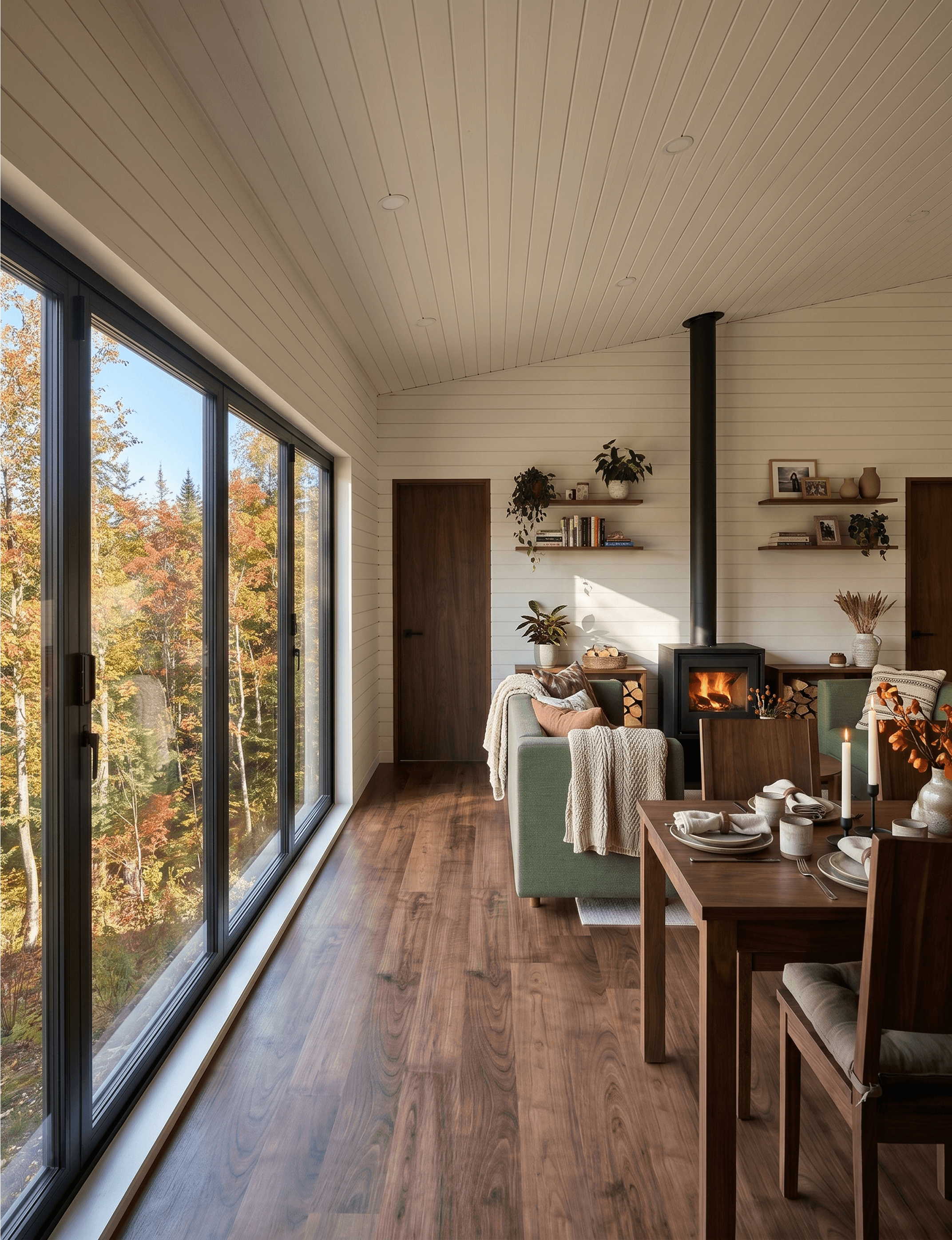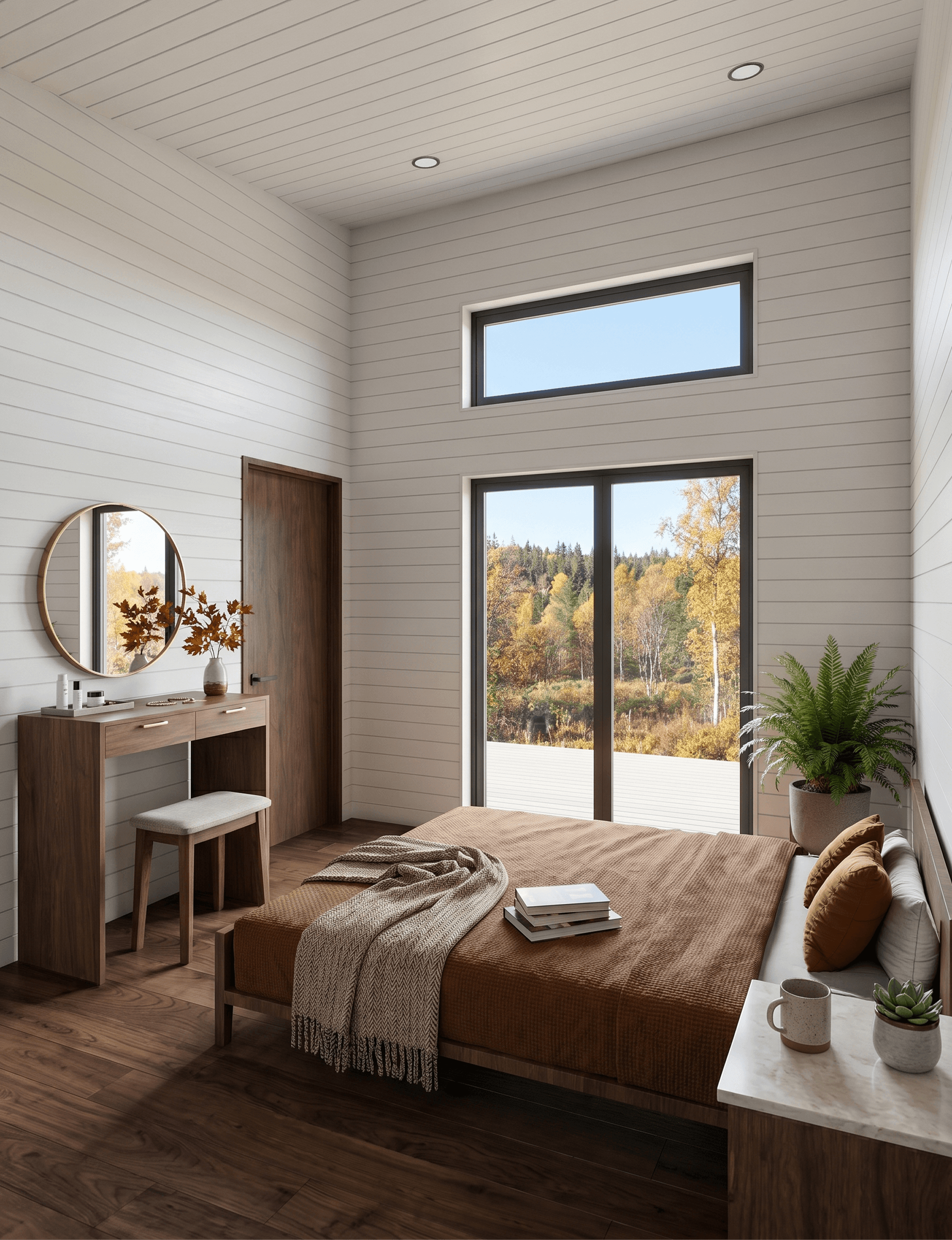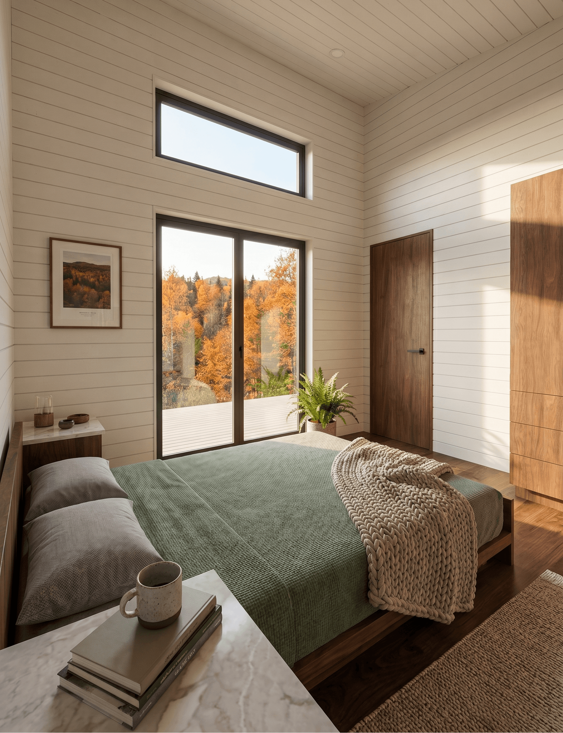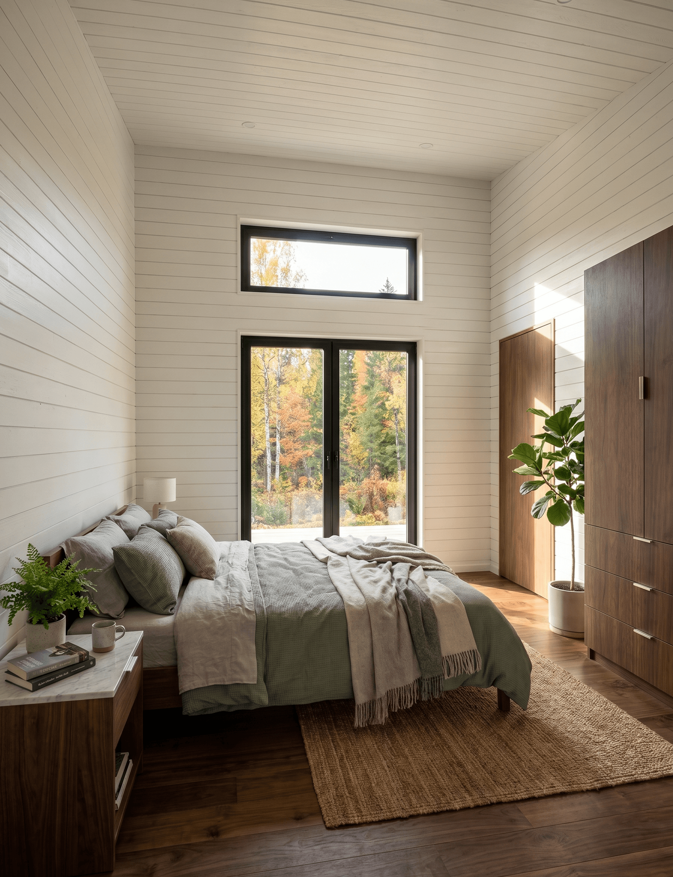 The master bedroom's a calm, unhurried room. The walls and ceiling are the same cream shiplap as the rest of the home, and the dark timber floor grounds the space without making it feel heavy. Full-height sliding glass doors open to the forest outside, framing an autumn landscape through a black-framed door that spans most of the wall facing the exterior. A clerestory window above adds a secondary light source that shifts across the room through the day.