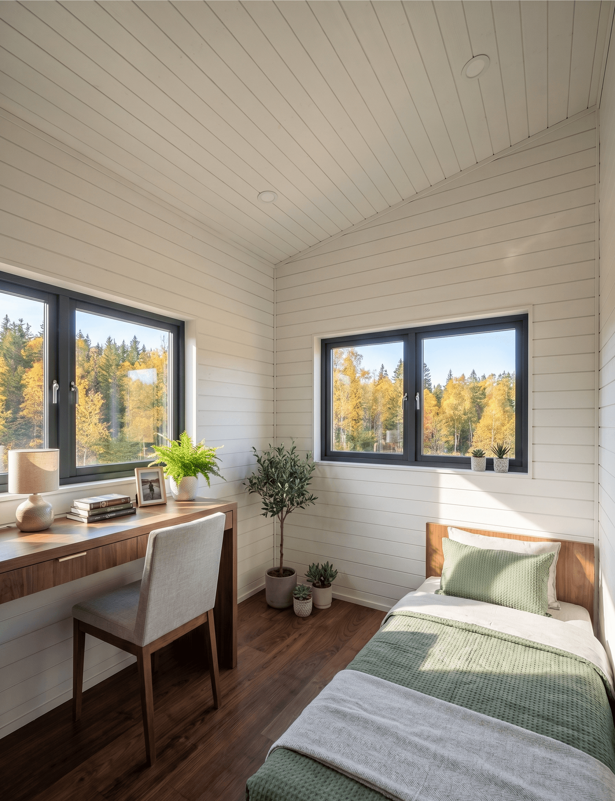 The third bedroom's set up as a single room with a built-in study space along one wall. A walnut desk runs the length of the left-hand wall, with two side-by-side windows above it that look out into the surrounding forest. The windows are casement-style rather than sliding glass doors, a narrower, more private format that suits a work-focused room.