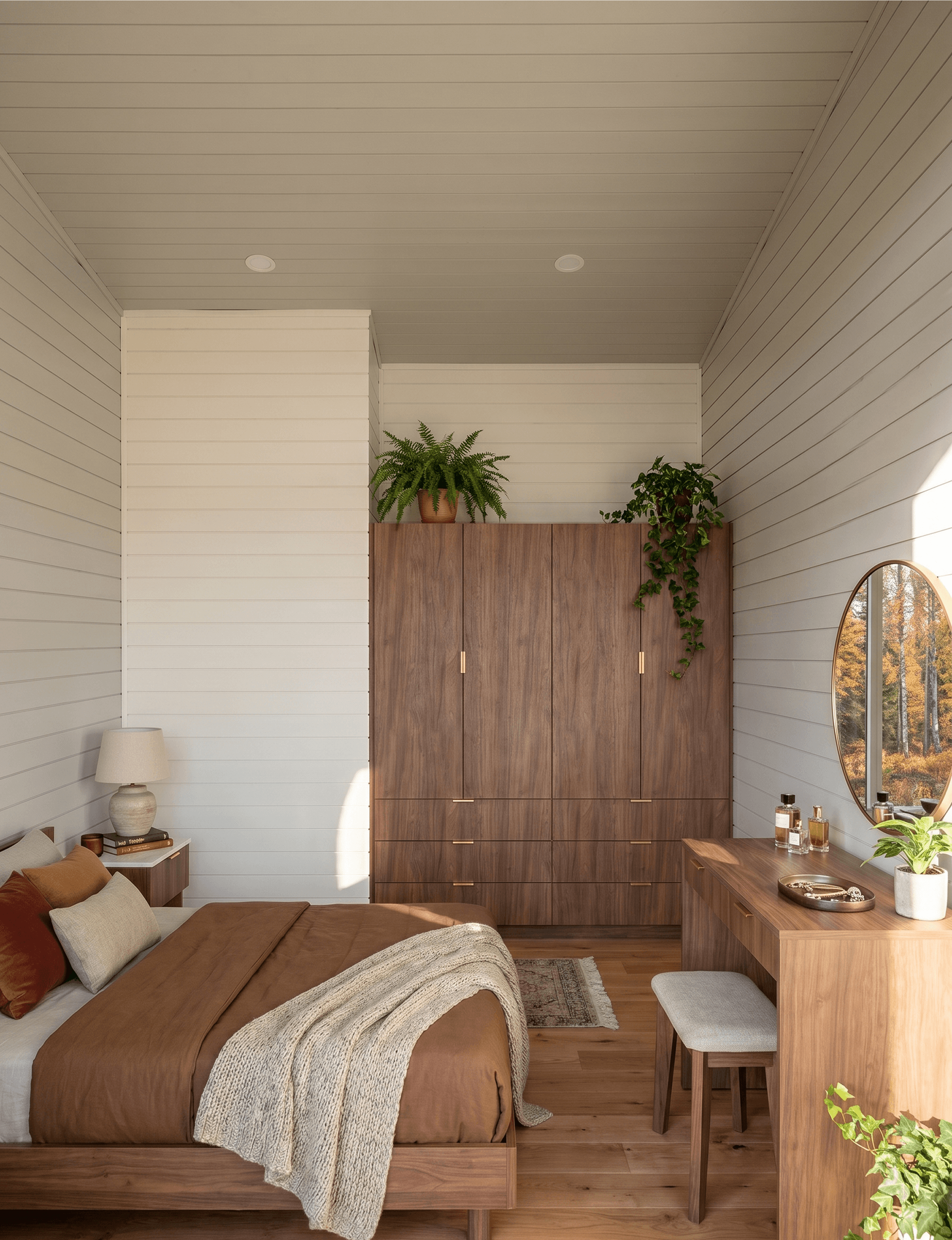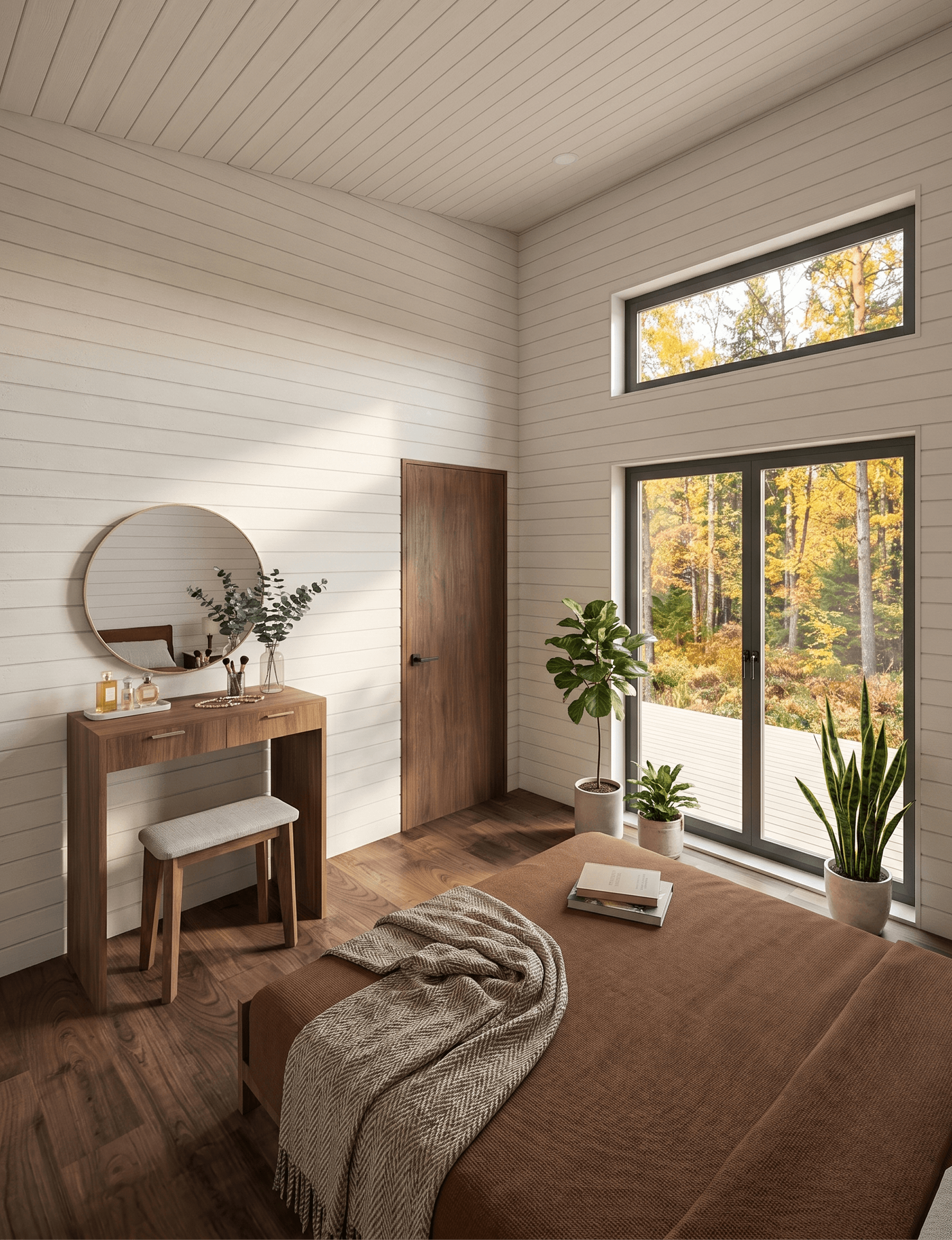 A walnut dressing vanity sits against one wall, with a round mirror and brass hardware that picks up the same detail language used in the bathroom and kitchen. The bed's positioned to take in the forest view, which makes the glazing feel like an intentional design decision rather than just a window placed for compliance.