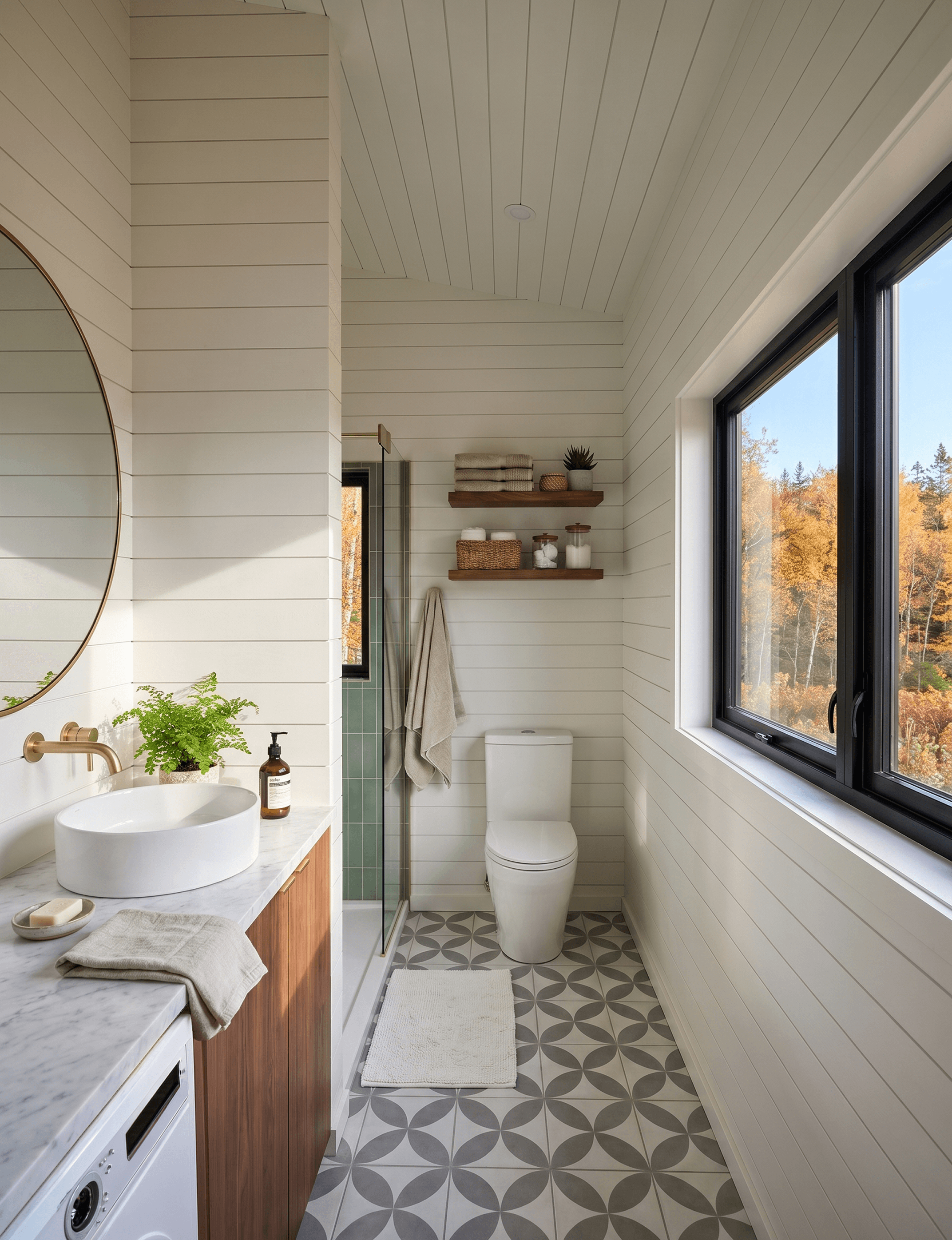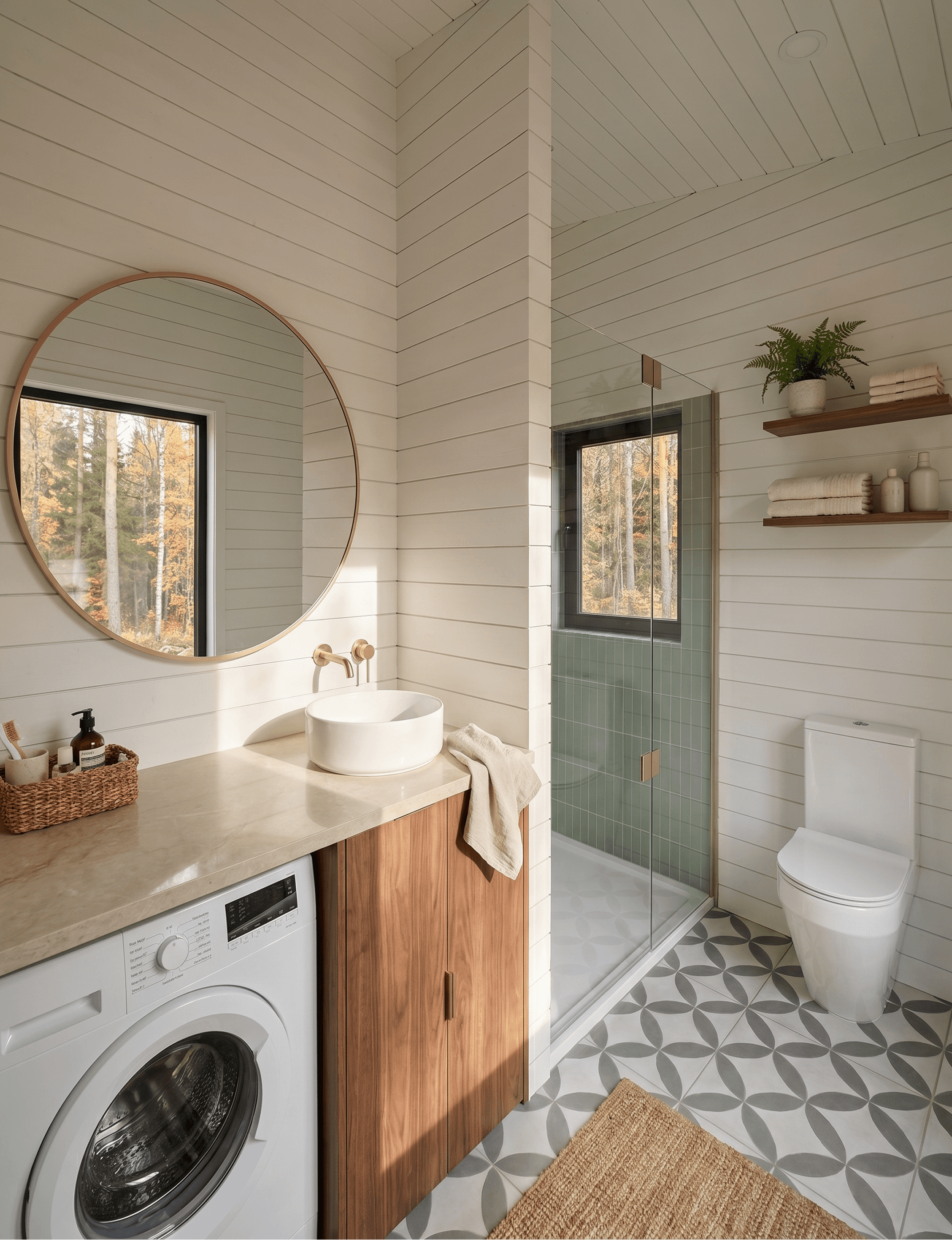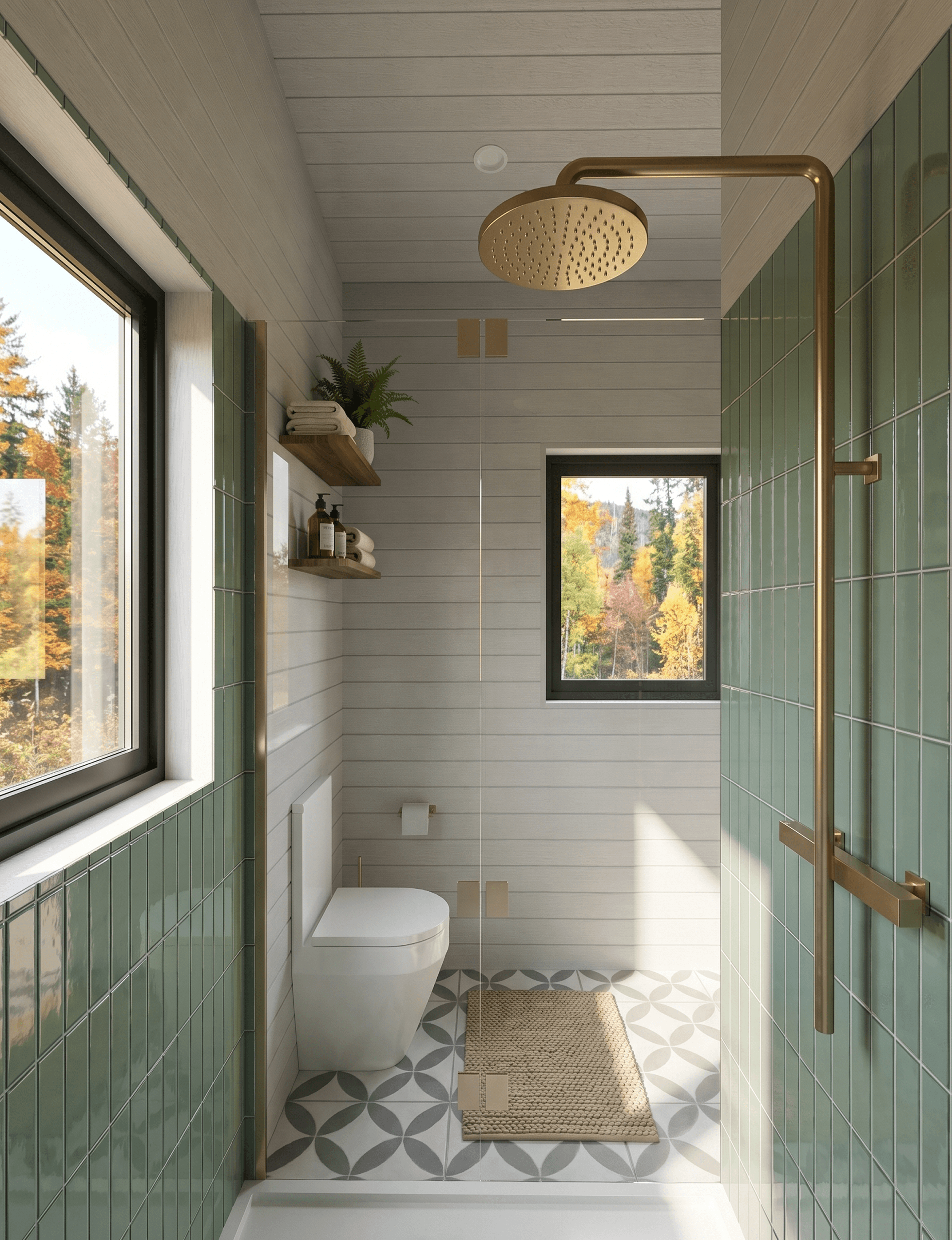 The shower is enclosed by a frameless glass screen and uses full-height sage-green tiles across the back wall, the same green tone that appears in the kitchen backsplash, creating a quiet material thread that runs through both rooms without feeling forced. The floor tiles are a patterned grey-white geometric design, adding visual interest at ground level without clashing with the rest of the palette. Tapware throughout is brass, consistent with the kitchen and consistent with the overall warmth of the home.