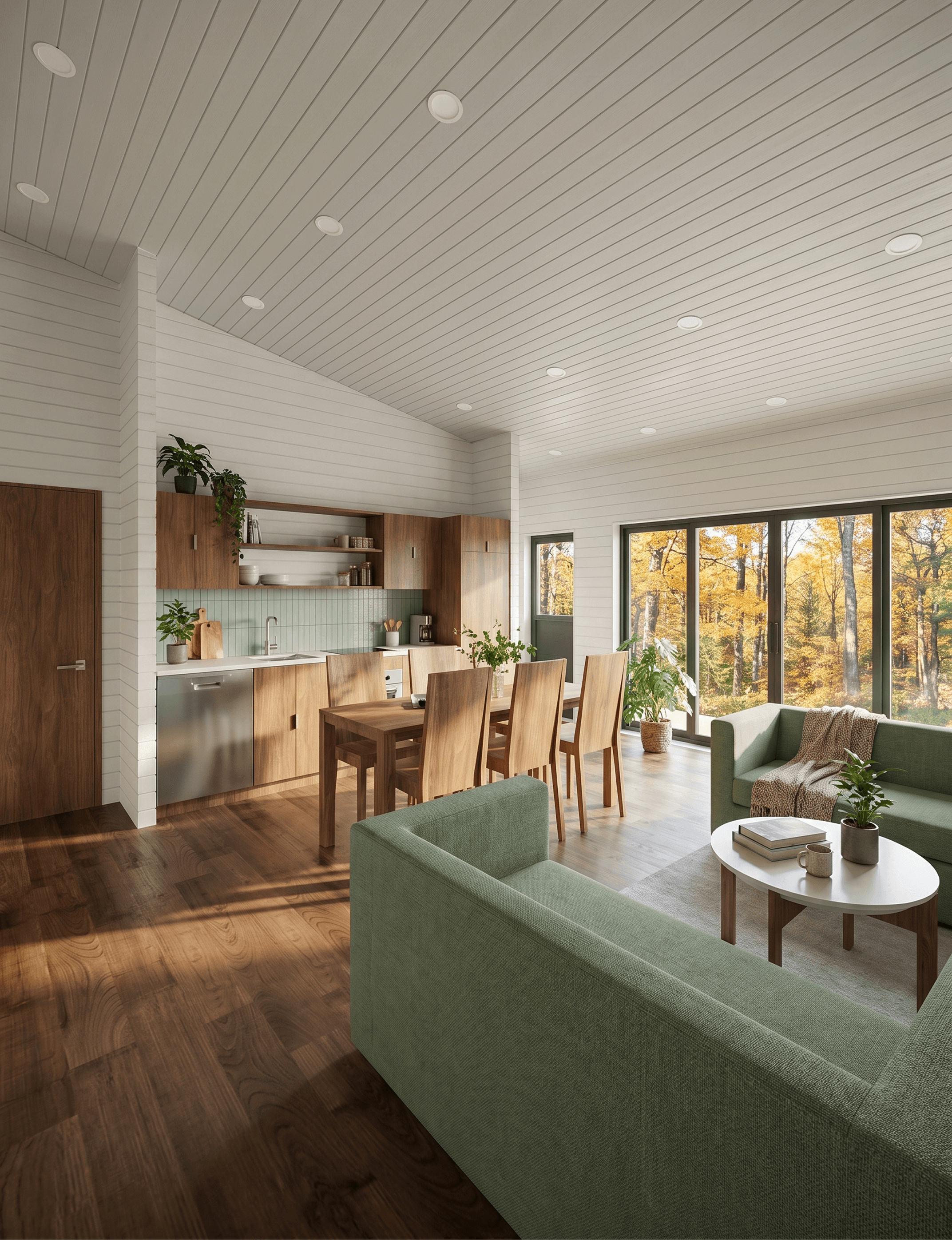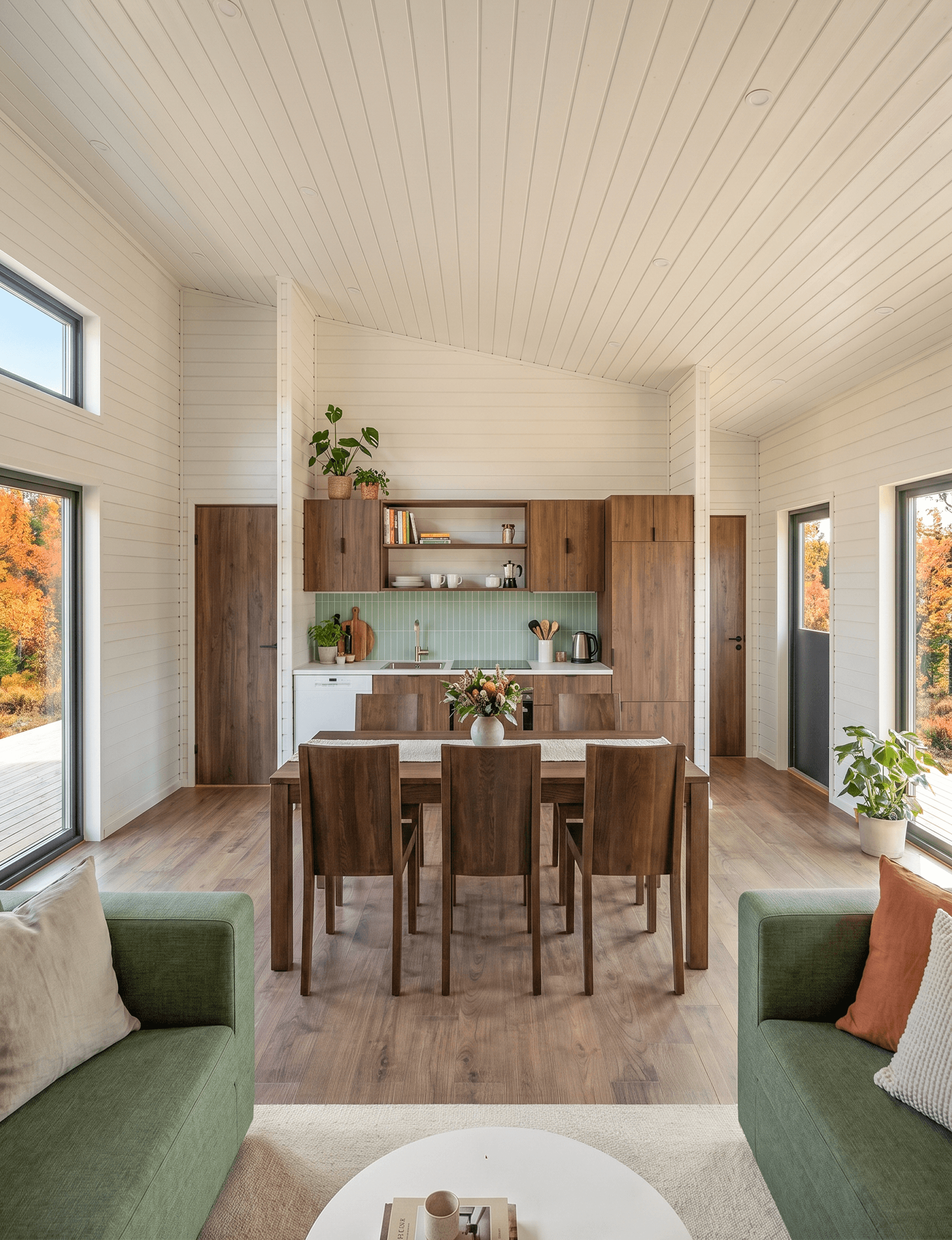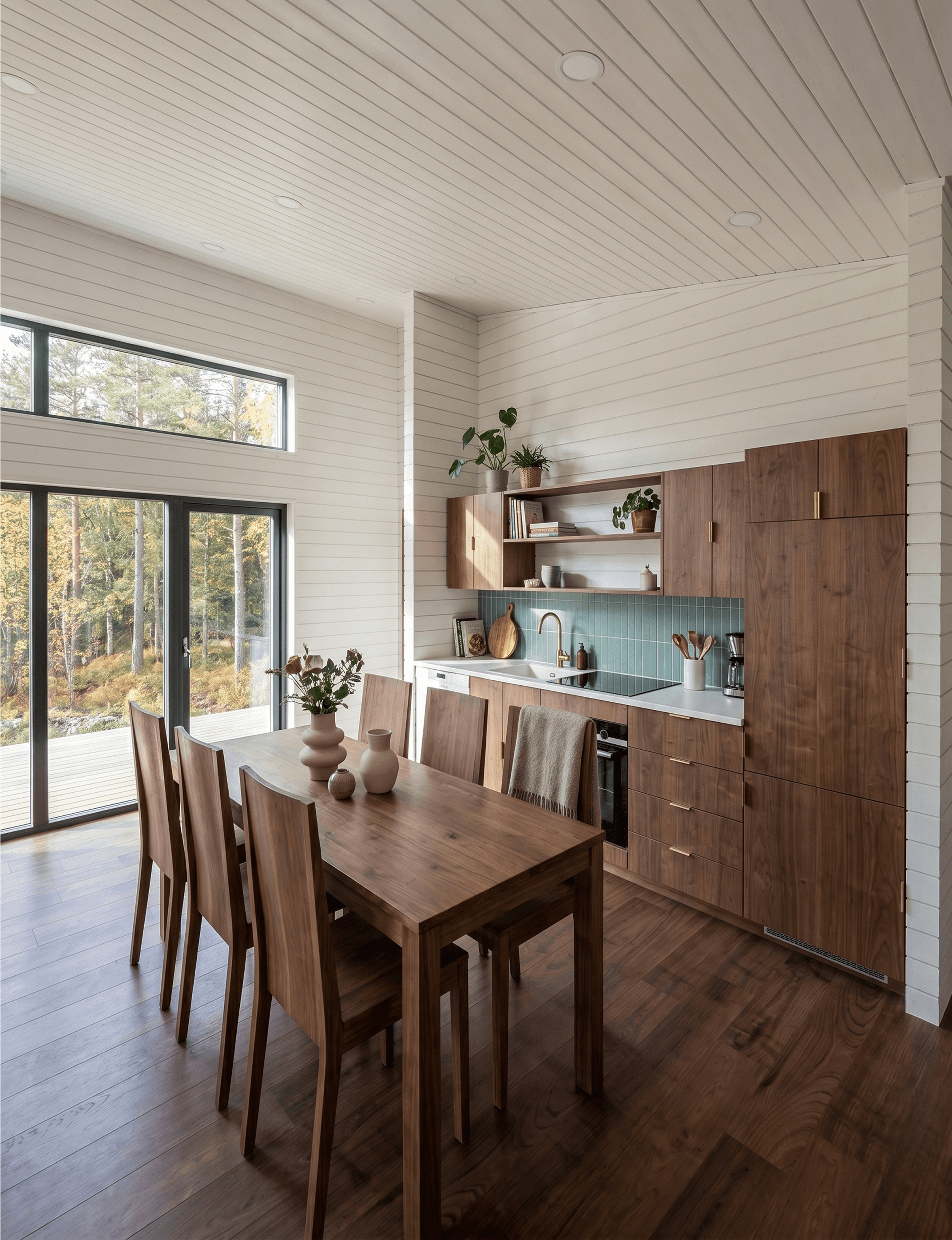 The dining table is a solid walnut piece that seats six comfortably. It sits close enough to the kitchen to make serving easy, and close enough to the living area to keep the room feeling connected rather than split into separate zones. For a 900 sq ft cabin plan that needs to work for families or groups, that open relationship between kitchen, dining, and lounge is one of the more important design decisions in the whole floor plan.