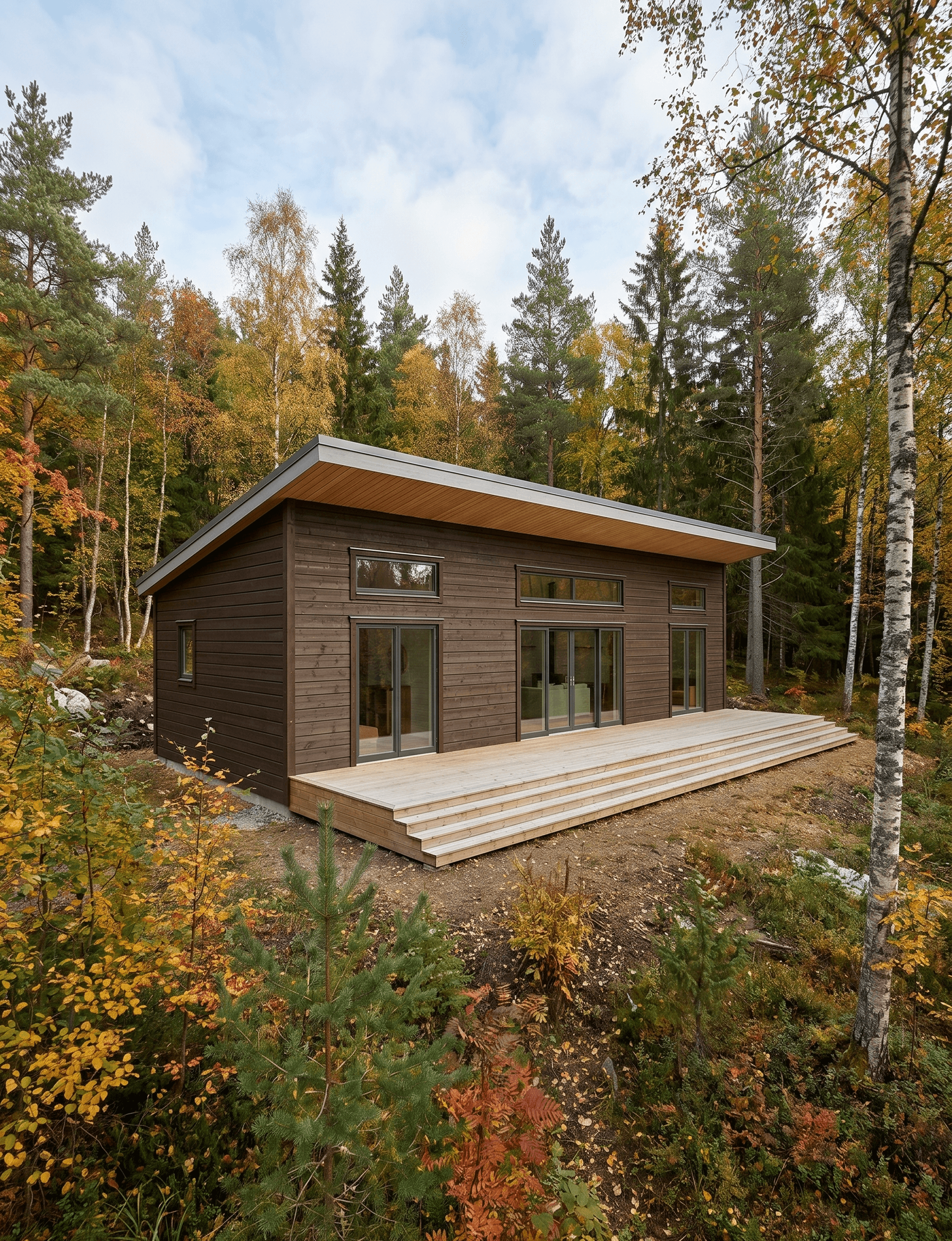 A natural timber deck with stepped entry extends from the front, creating an outdoor zone that benefits form the overhang above.
