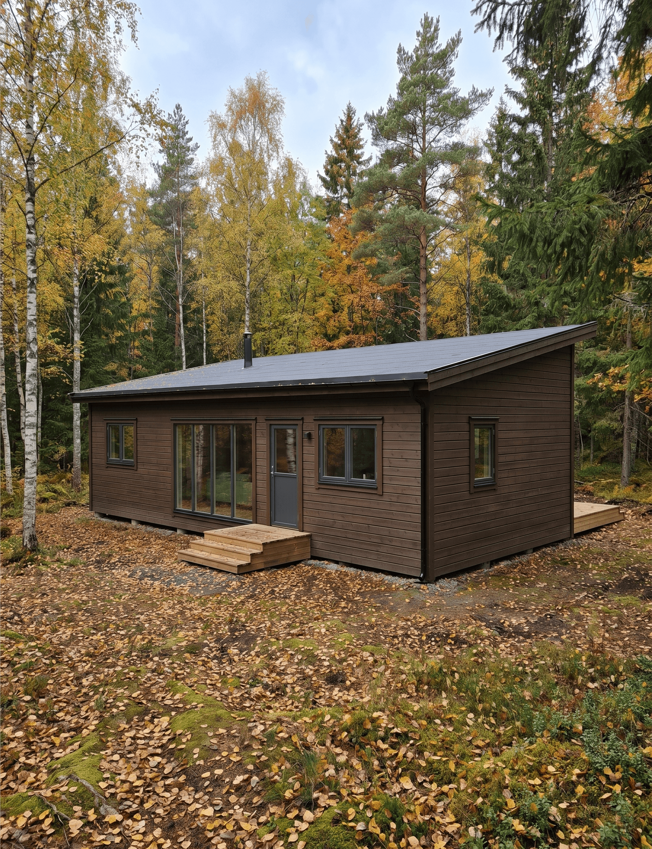 Dark-stained horizontal timber cladding covers the exterior across all four elevations. It reads as a deep brown-charcoal in natural daylight, and it gives the cabin a weight and presence that lighter or lighter-toned finishes wouldn't achieve. The soffits beneath the overhang are finished in a lighter cedar tone, providing a warm contrast that breaks up the darker body and draws attention to the transition between roof and wall. Black-framed windows and sliding glass doors carry the dark palette forward without adding another colour to the mix.