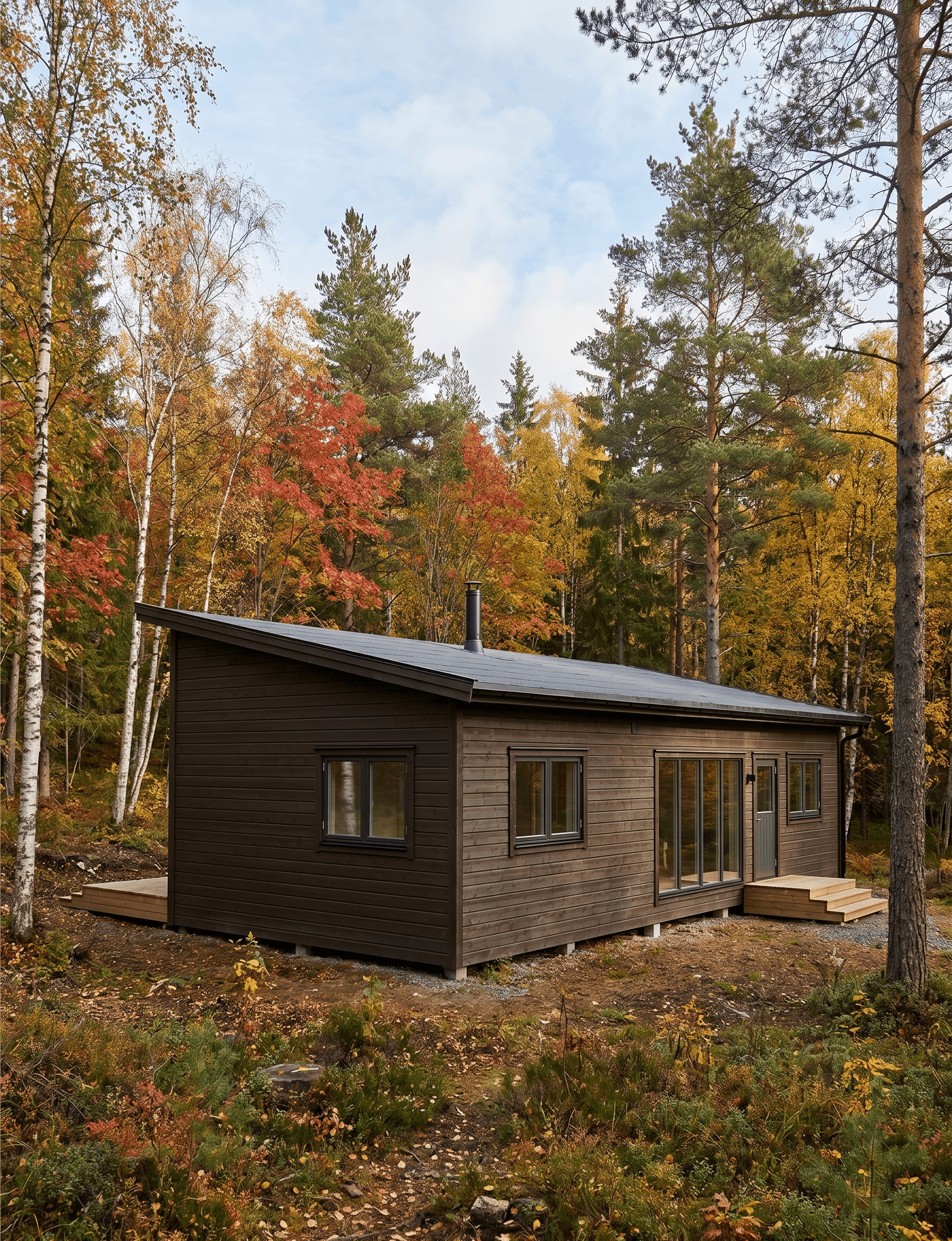 A wood stove flue pipe exits through the roofline at the rear, marking the heart of the home from the outside.