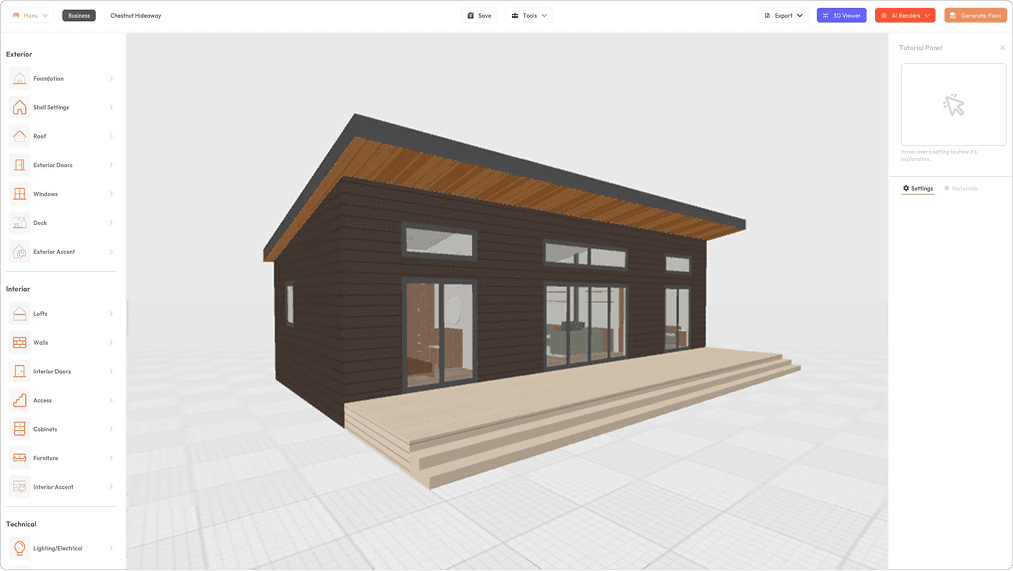 Every part of this cabin plan concept, from the exterior details to the interior layout, was designed entirely within the Tiny Easy platform. No third-party tools, no hand-drawn floor plans, no outsourced renderings. From the first concept through to final handoff documents, the whole process lived in one place.