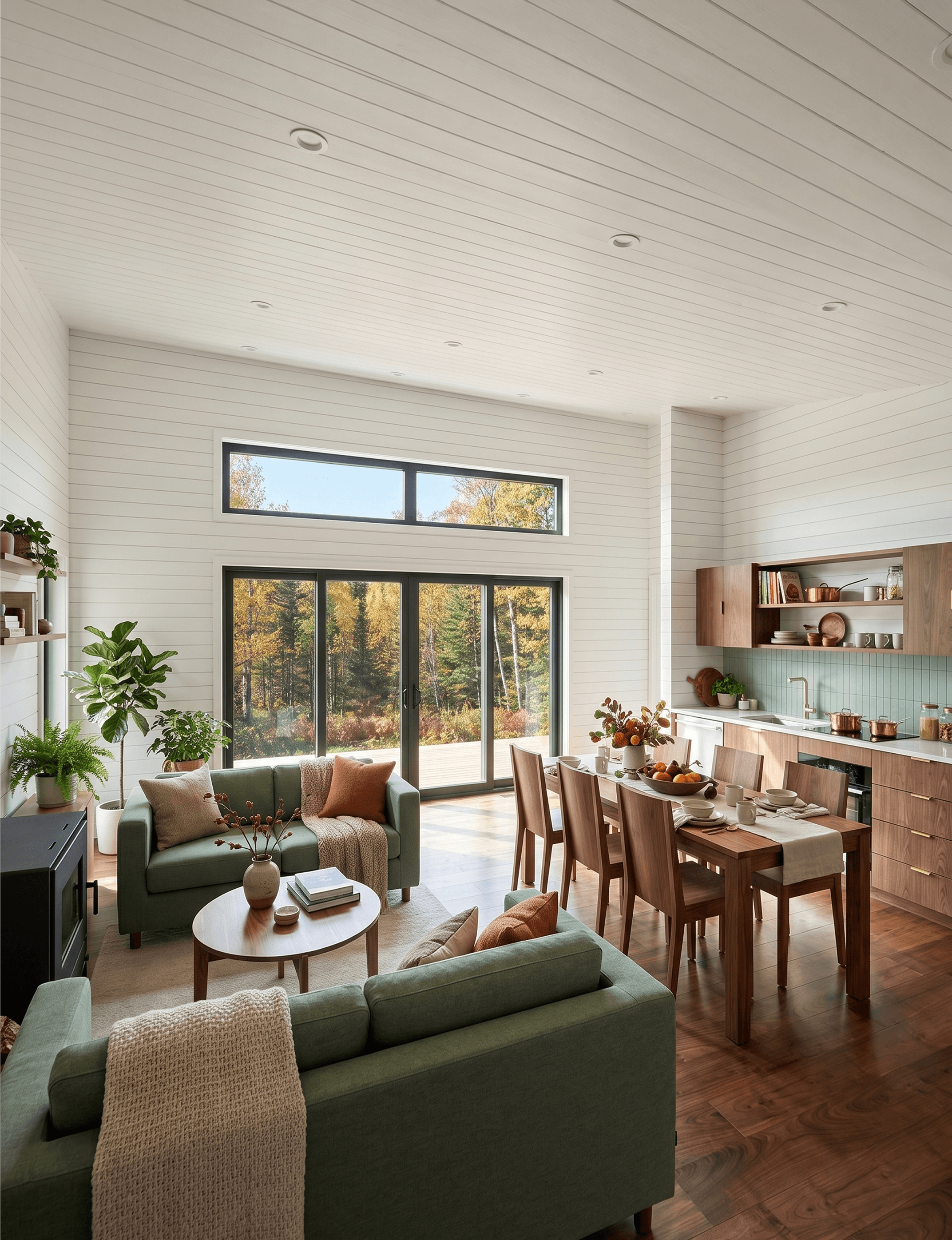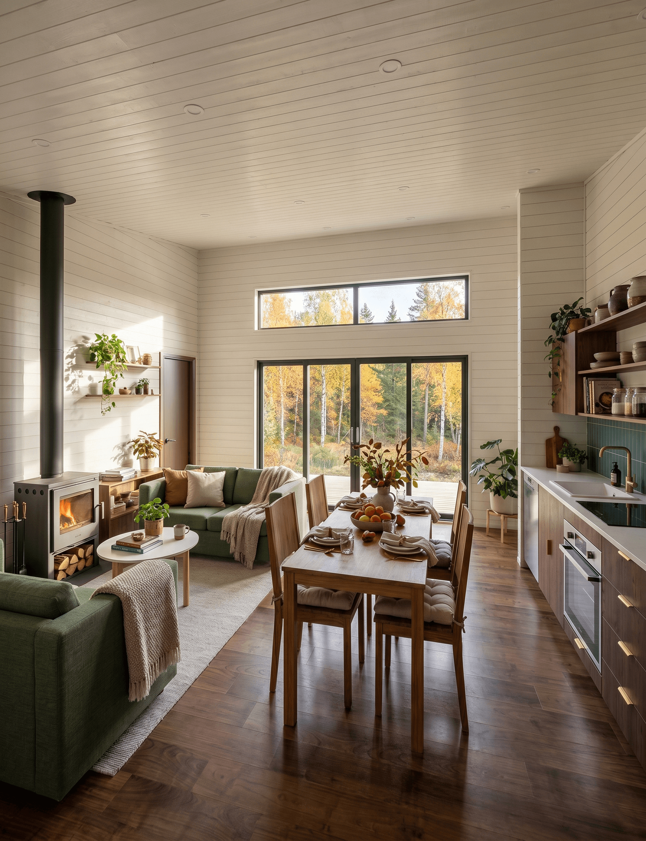 A freestanding wood stove sits at the heart of the living zone, dual green sofas face each other across a low coffee table, and a walnut dining table seats six. This isn't a cabin where the living room was an afterthought. It's the reason the design exists.