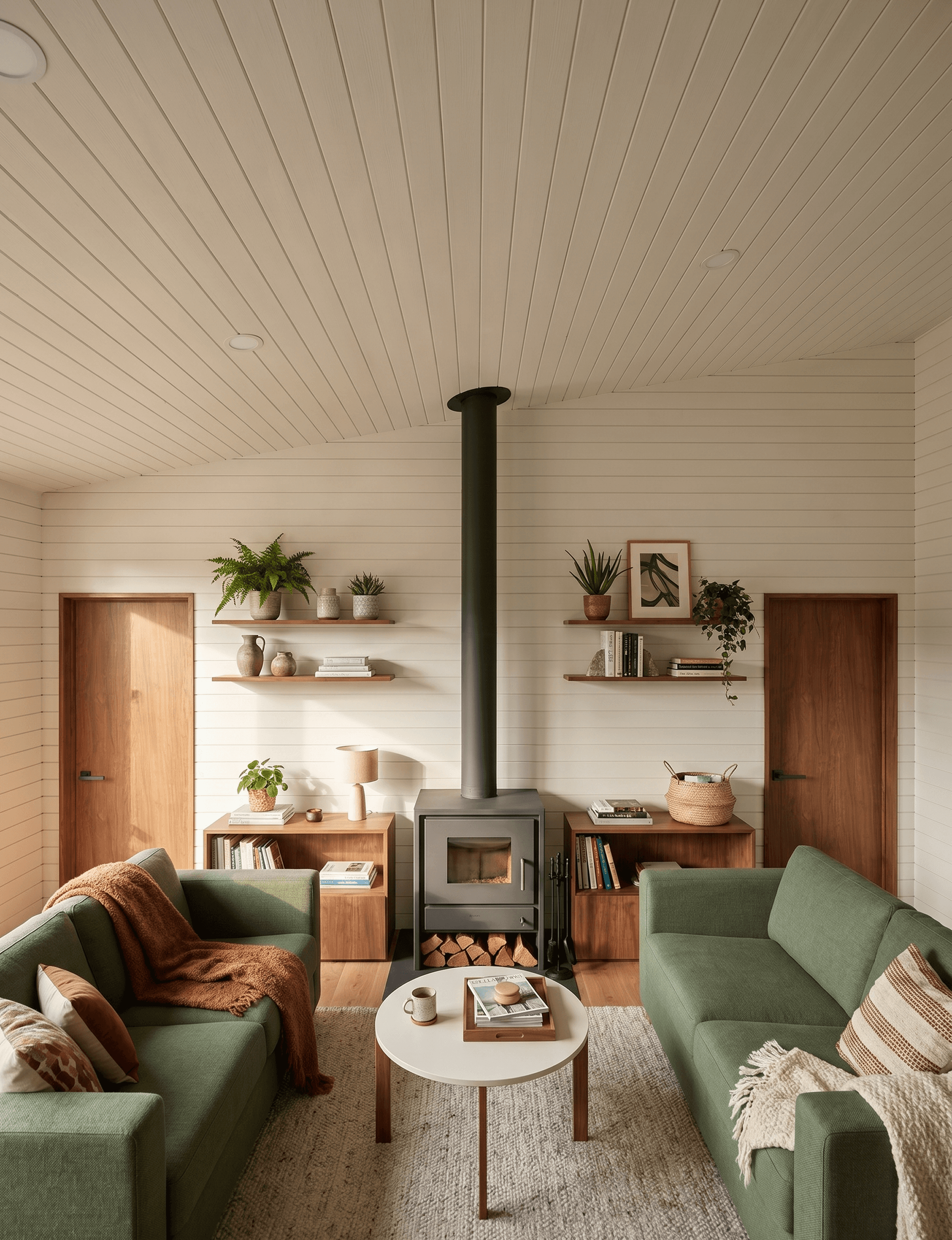 The living zone is positioned as the anchor of the open-plan core, not as a leftover space at the end of the kitchen run. A freestanding wood stove with a tall black flue pipe sits at its heart, not pushed into a corner, but placed as a deliberate social focus that the rest of the furniture is arranged around.