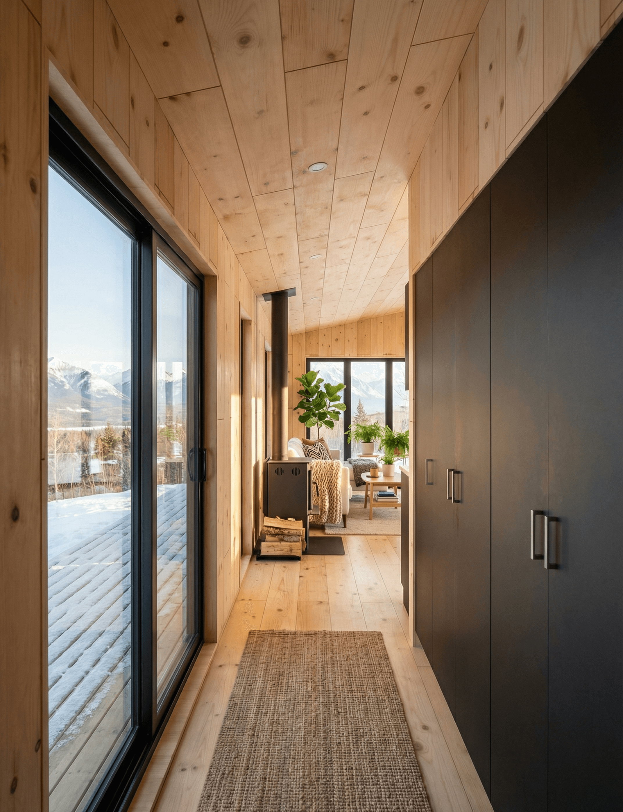 Stepping inside, the cabin opens into a narrow entry hallway with floor-to-ceiling black built-in storage on one side and a black-framed sliding glass door on the other. It's a practical transition zone that keeps outdoor gear out of the living space and creates a clear sense of arrival before the plan opens up ahead.