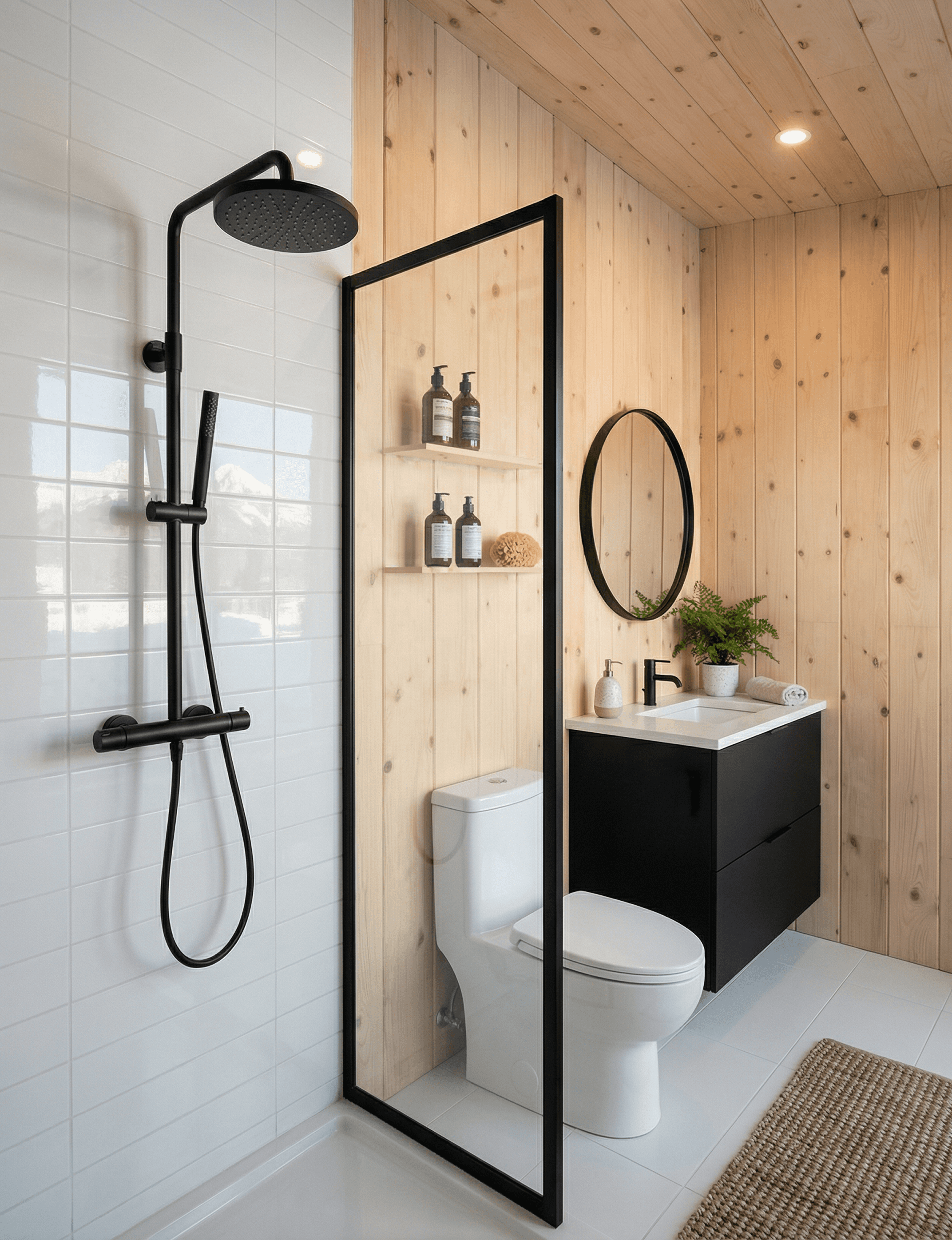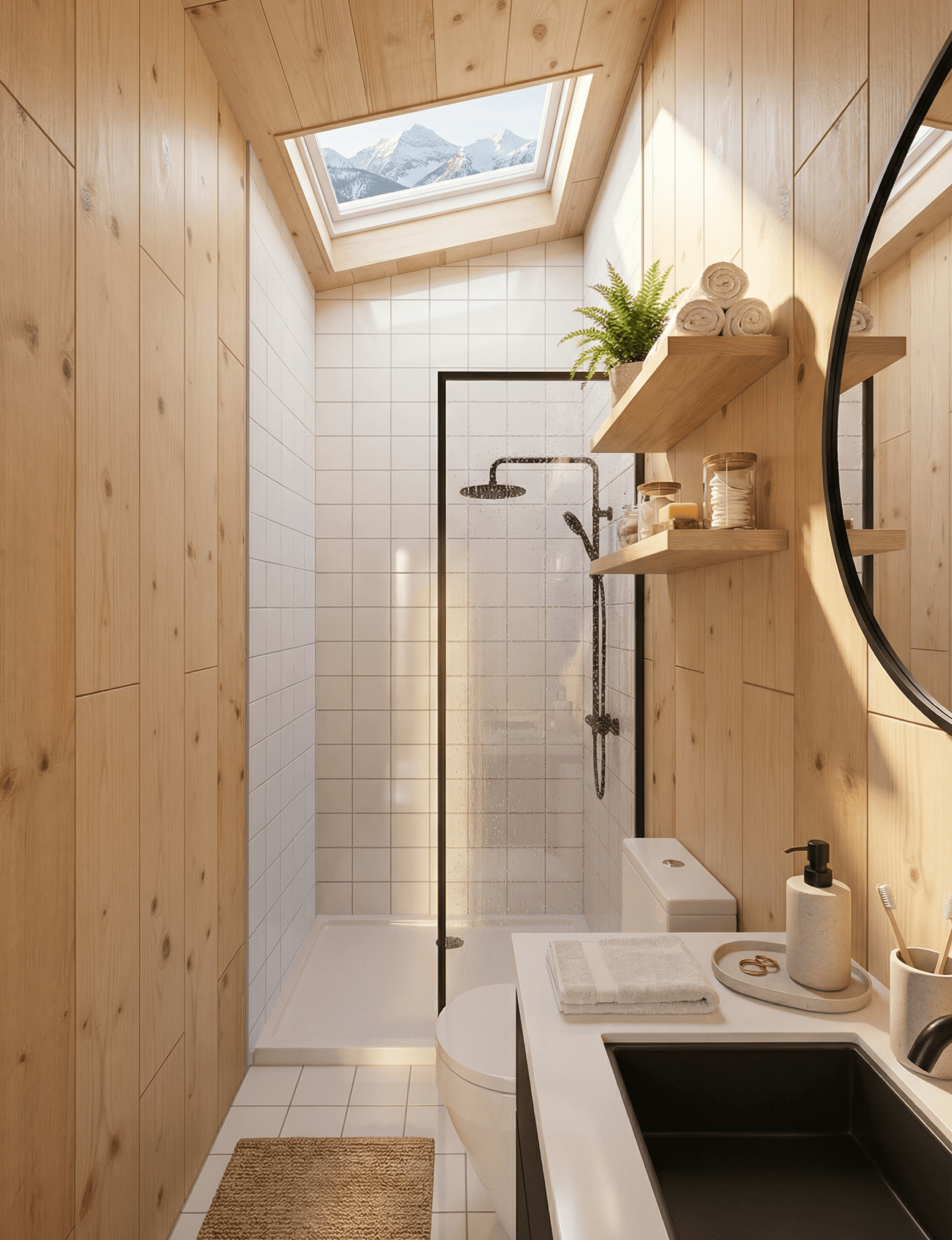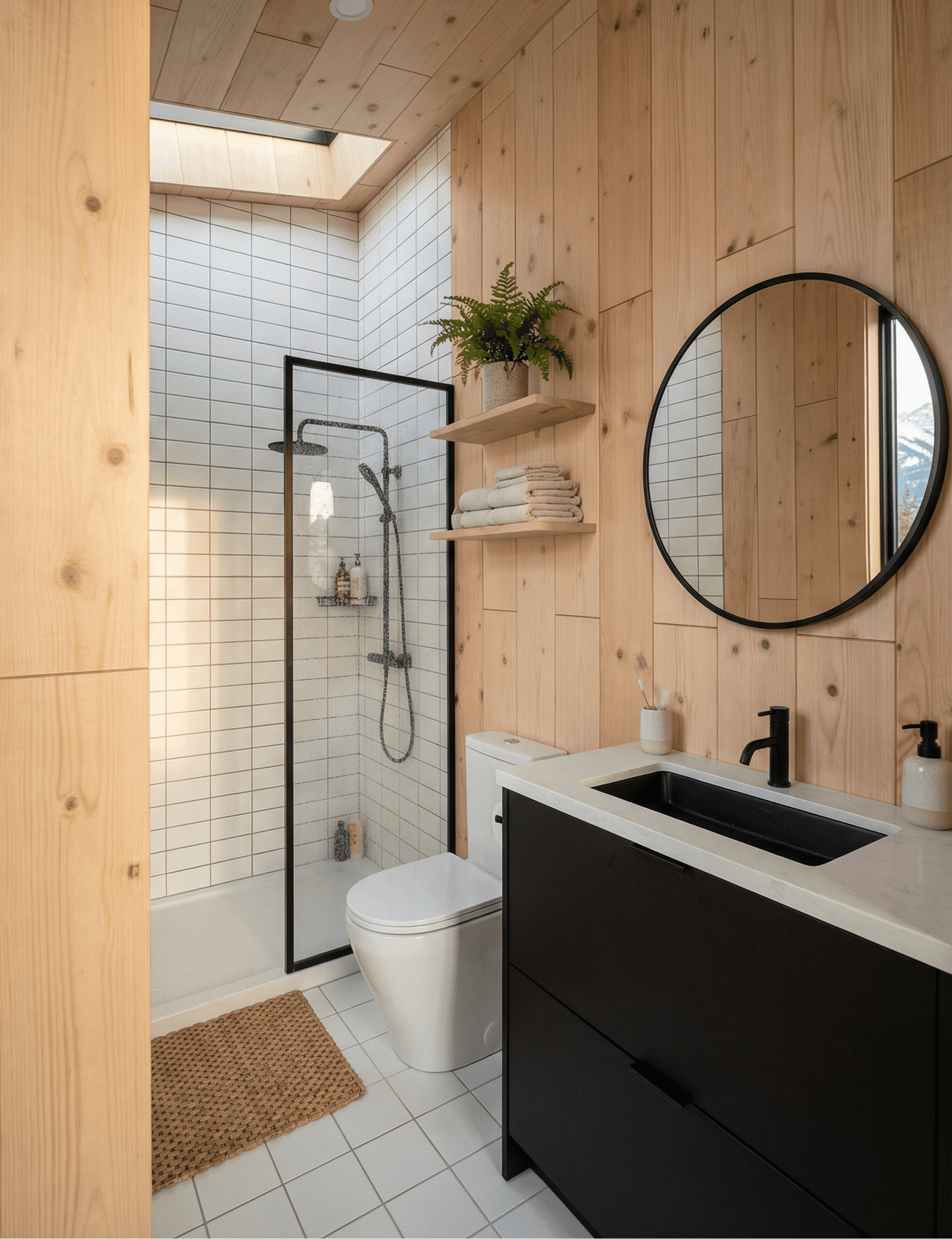 Nothing in the bathroom fights with the rest of the interior. The black hardware continues here without interruption, and the combination of pine cladding, white tiles, and black fittings keeps the space feeling resolved. A skylight above the shower area brings natural light into what is otherwise one of the more enclosed parts of the plan.