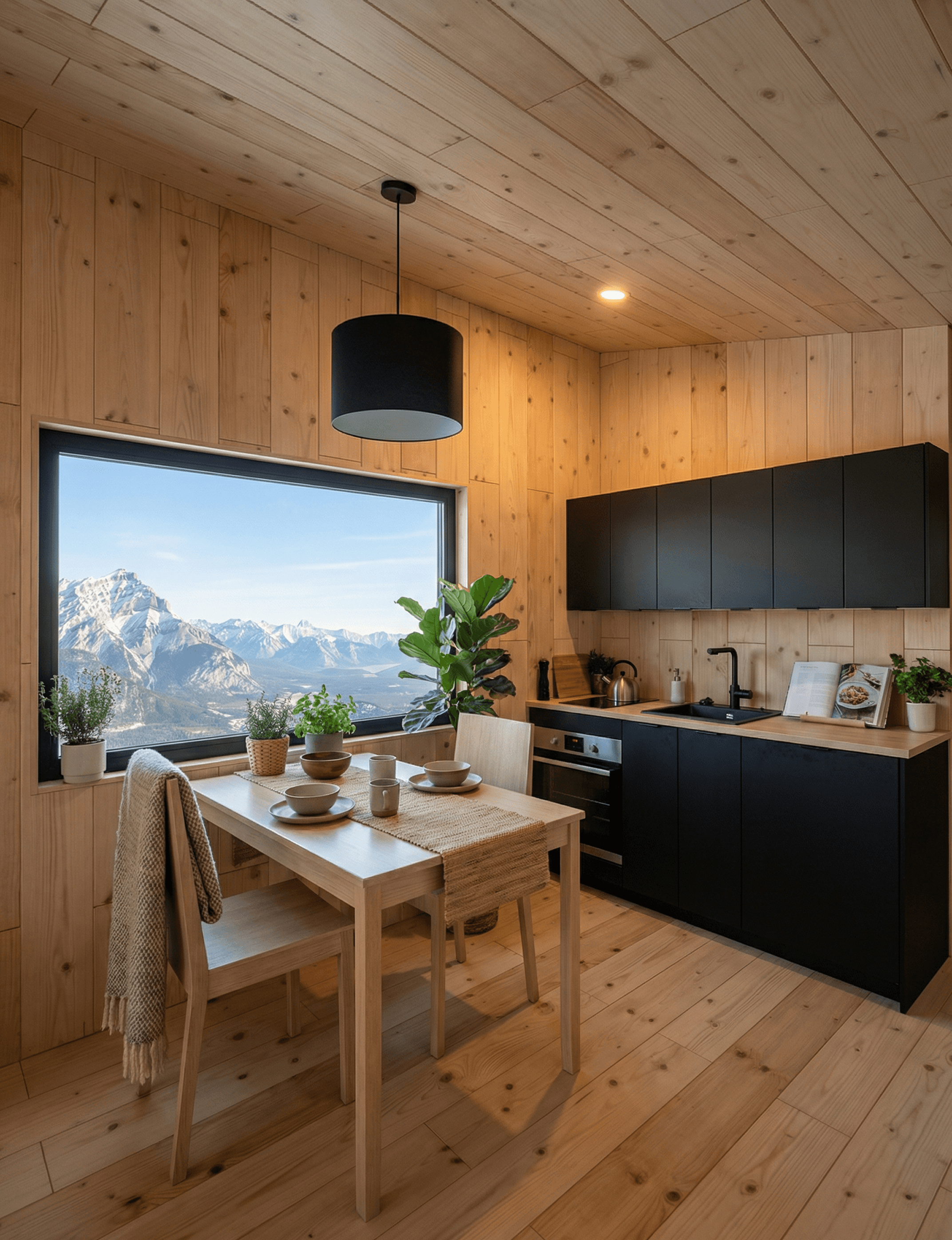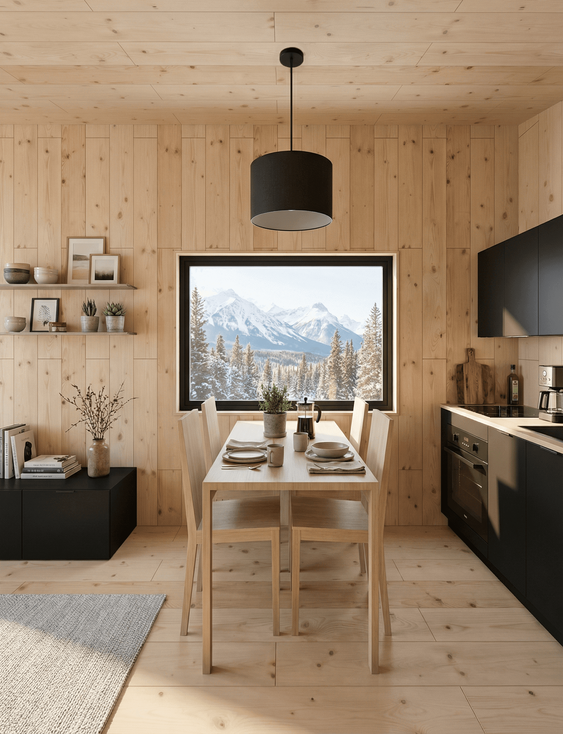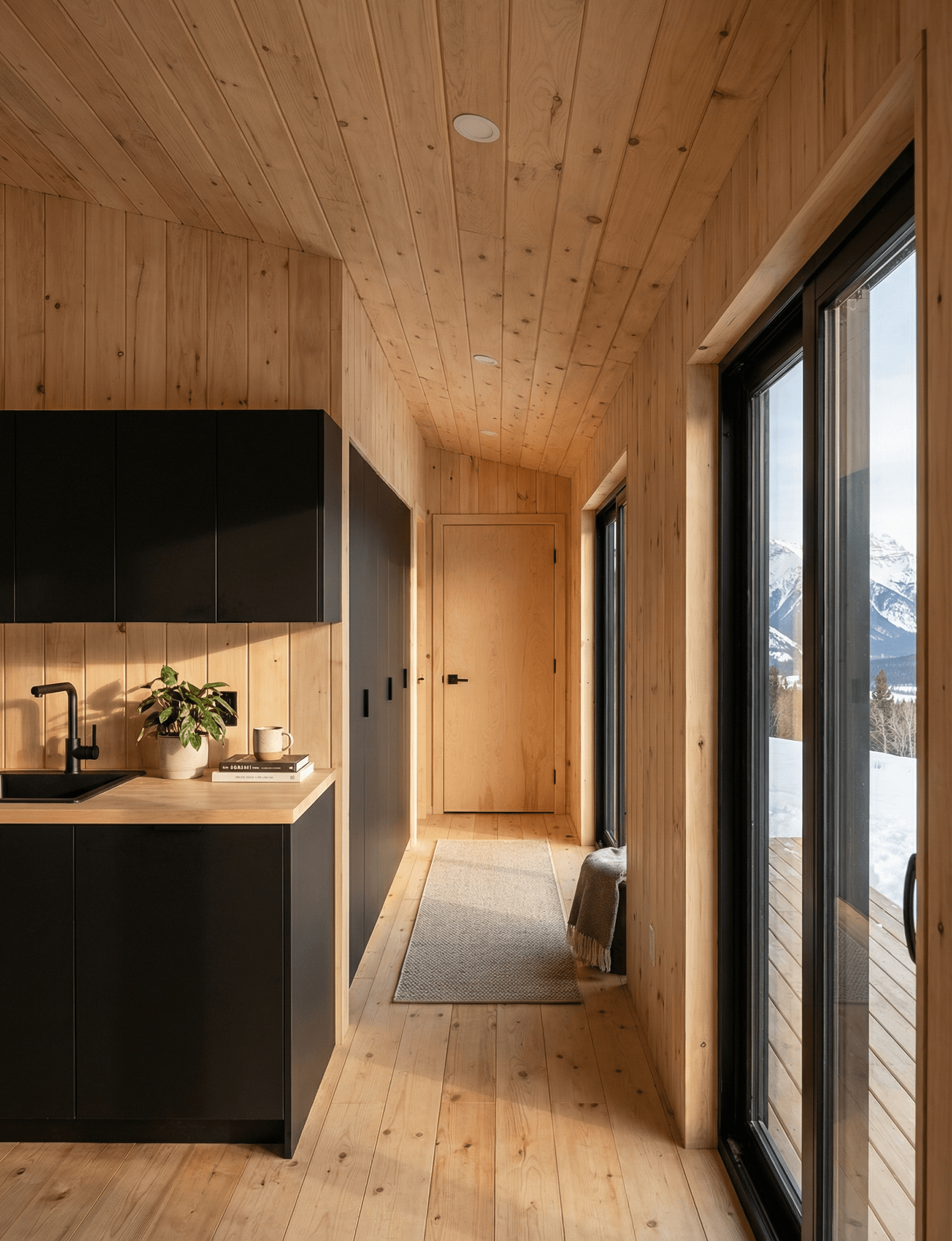 The BlackRidge Cabin works because its material palette is small and applied without exception. There are two primary materials in play, black and pine, and almost every decision in the design can be traced back to one or the other. It's worth noting that research into biophilic design consistently finds that the presence of natural materials like timber in interior spaces has a positive effect on how spaces feel to occupy — which goes some way to explaining why pine-lined interiors have remained a constant in well-regarded small home design.
