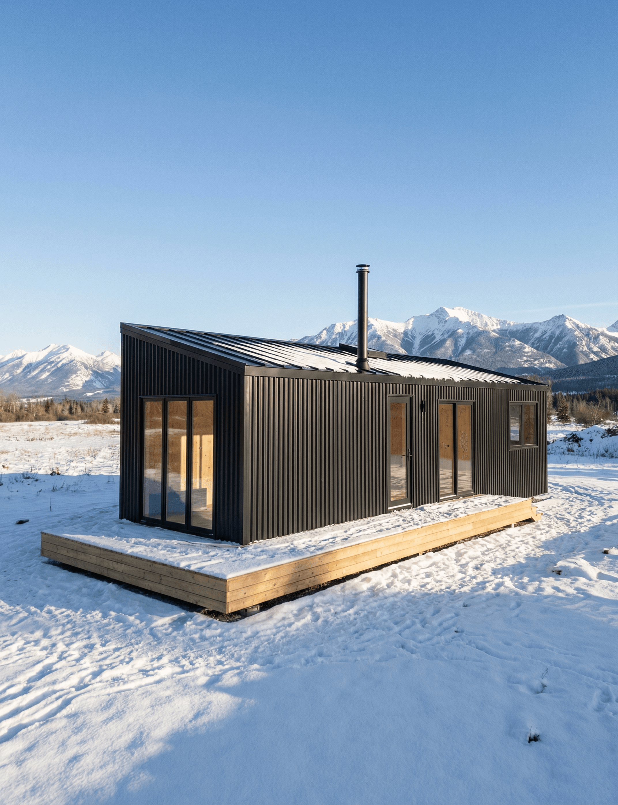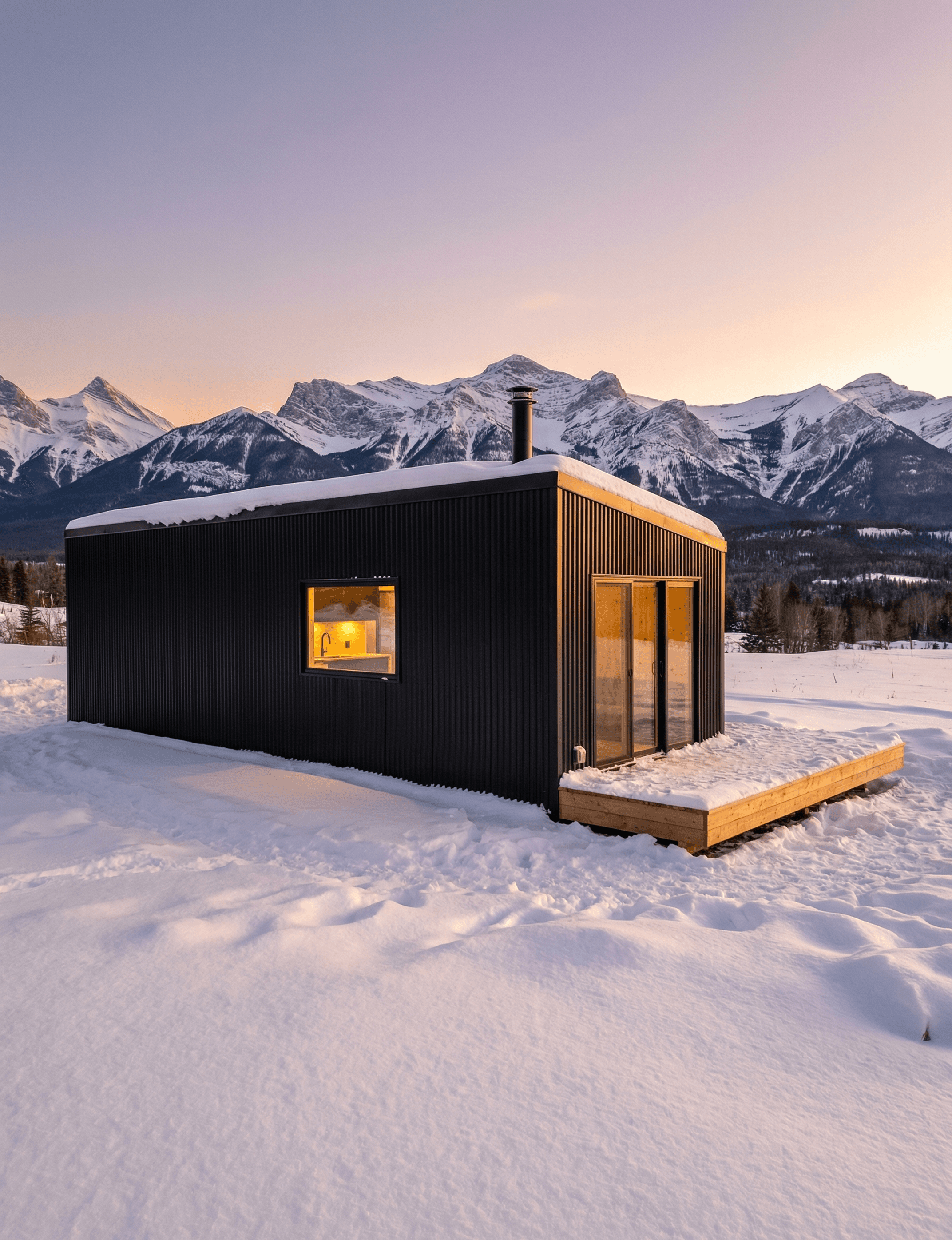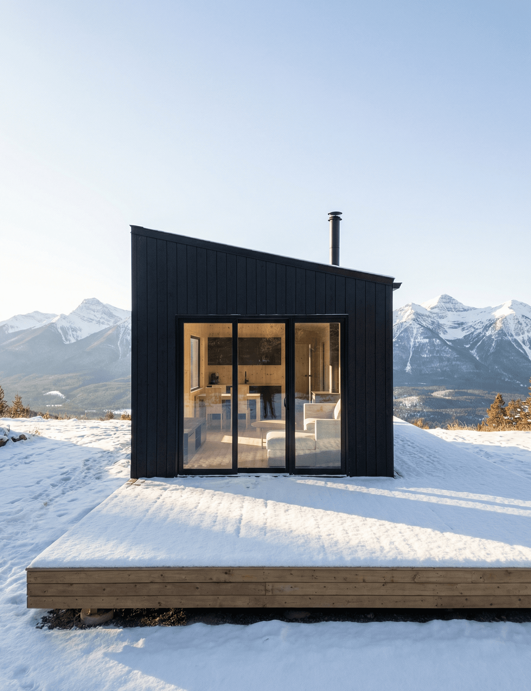 The glazing is handled with the same approach. A full-width black-framed sliding glass door spans most of the front face at living area height, which means the warm interior is visible from outside, amber light spilling through pine walls, a glimpse of the sofa, the stove, the view through to the mountains behind. The contrast between that interior warmth and the dark exterior shell is one of the design's strongest visual moments.