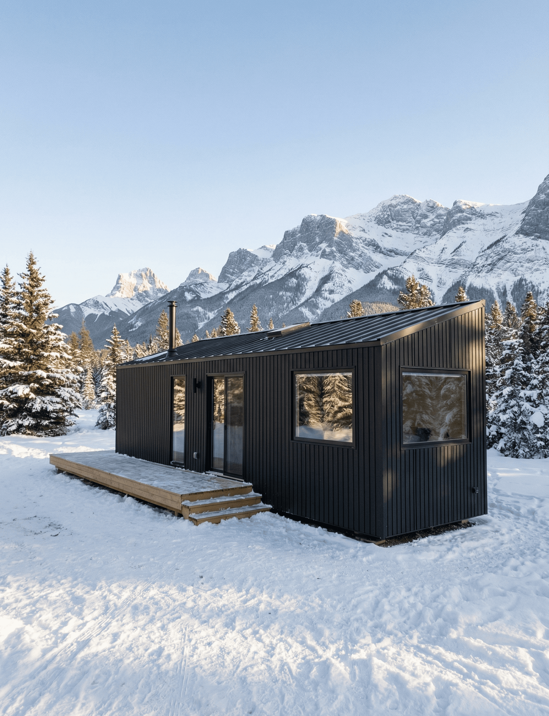 At the bedroom end, a mid-height picture window cuts into the black cladding. A secondary entry door sits at the other end with timber entry steps leading up to a natural pine deck. The deck extends along the front face of the cabin, connecting the entry and the main living zone at ground level. For a site with any kind of view, a mountain range, open land, a forest clearing, that outdoor platform becomes an extension of the interior as much as it is a threshold.