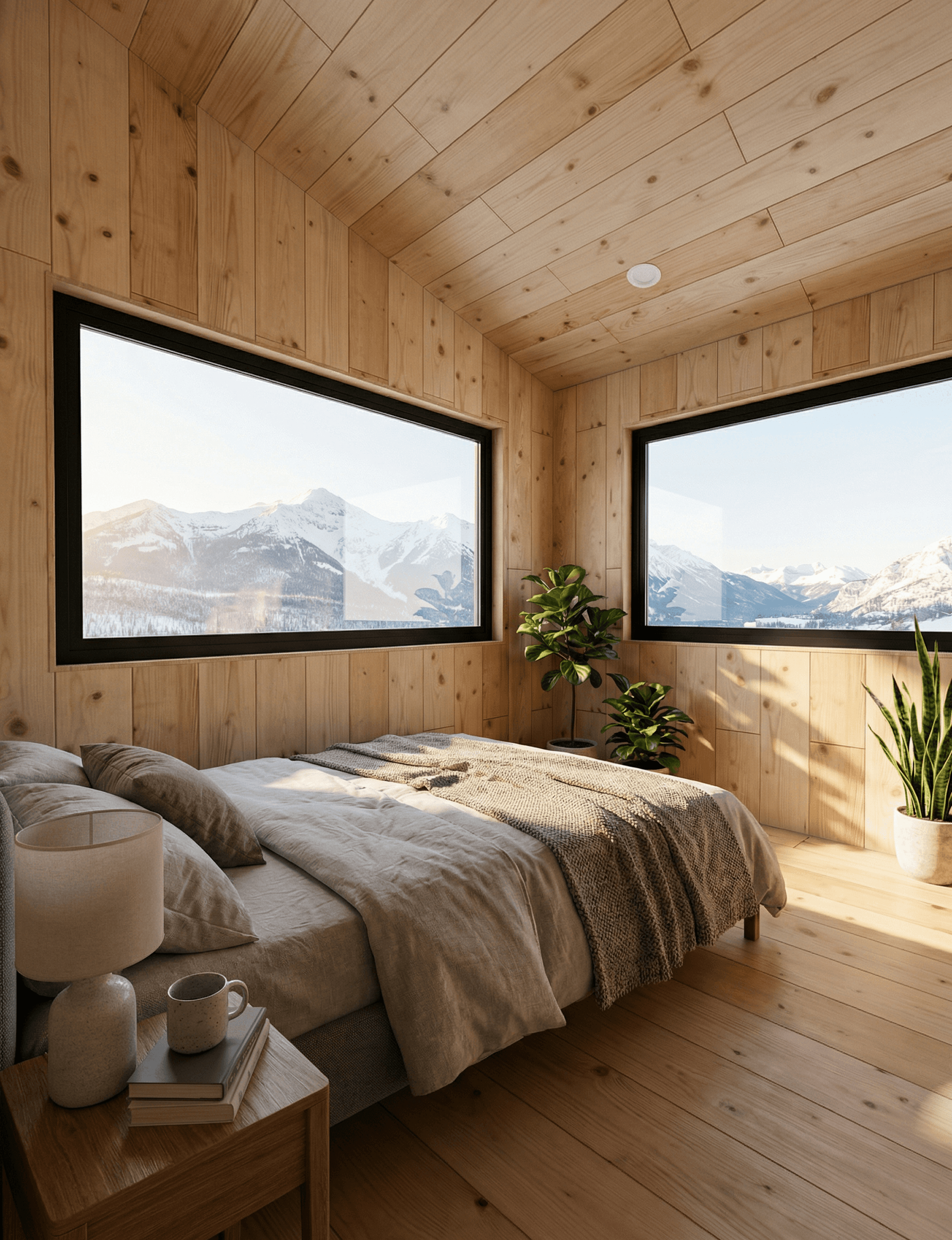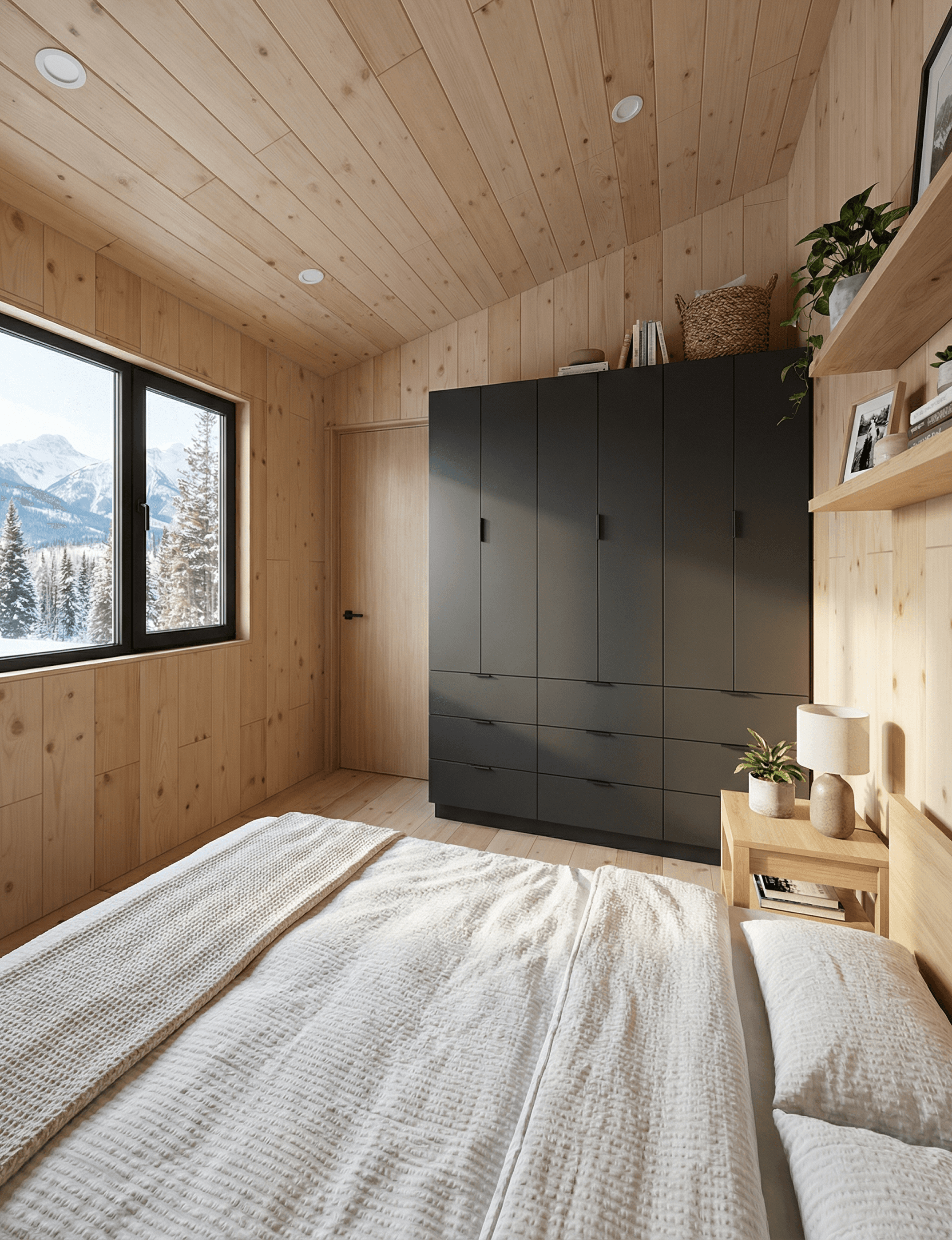 On the opposite side, a large black-framed picture window looks out to the mountain and forest beyond. Rather than tucking the bedroom at the end with a small or high-set window, this design treats the bedroom view as seriously as it treats the living room view. Waking to that outlook is clearly part of the experience the design is built around.