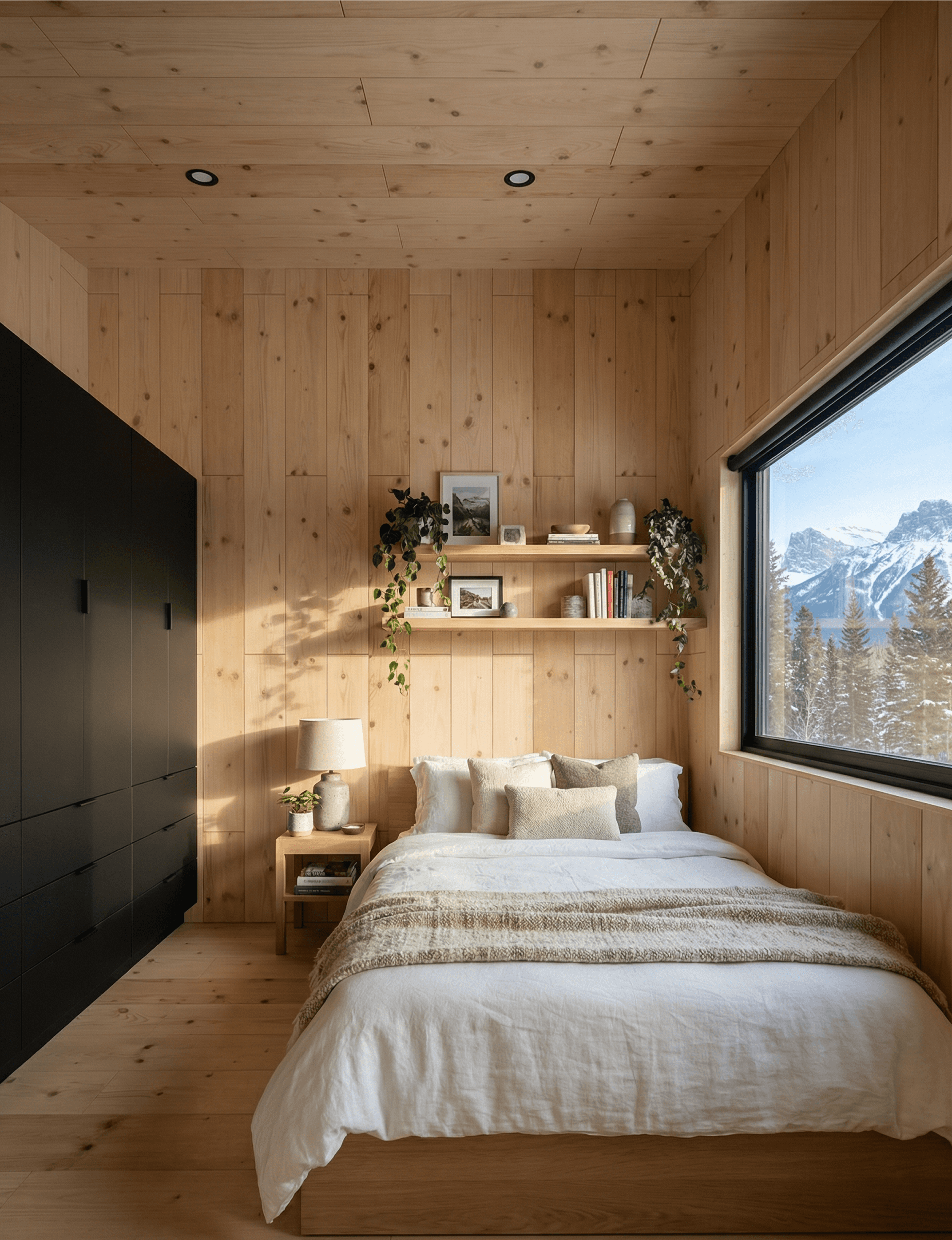 The bed is a double, centred in the room with white linen and a natural throw. A floating timber shelf above the bedhead carries trailing plants, a lamp, and a few small objects, simple styling that functions as the bedhead without requiring additional joinery. A floor-to-ceiling black built-in wardrobe occupies one wall, providing full-height storage with the same minimal bar handle hardware that runs through the rest of the cabin.