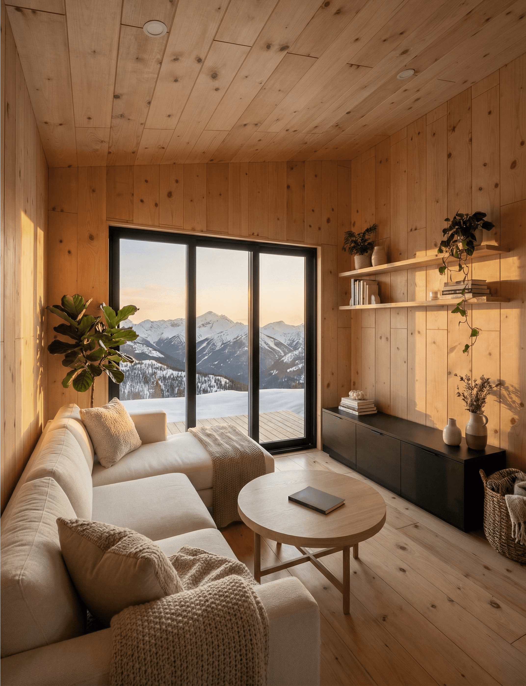 The sofa faces the main sliding glass door, which means the primary living position — sitting, reading, pausing — aligns directly with the outdoor view. At sunset, light from the mountain horizon fills the pine walls with warm amber tones that shift across the ceiling. The effect isn't manufactured. It comes directly from the window placement and the material choice.