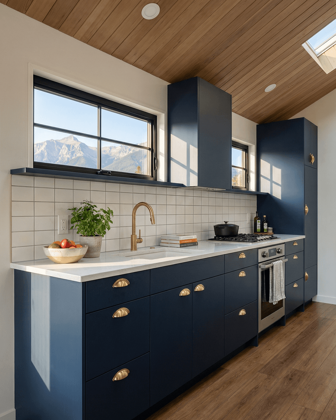 The Kitchen: Navy, Brass, and a Single Clear Wall