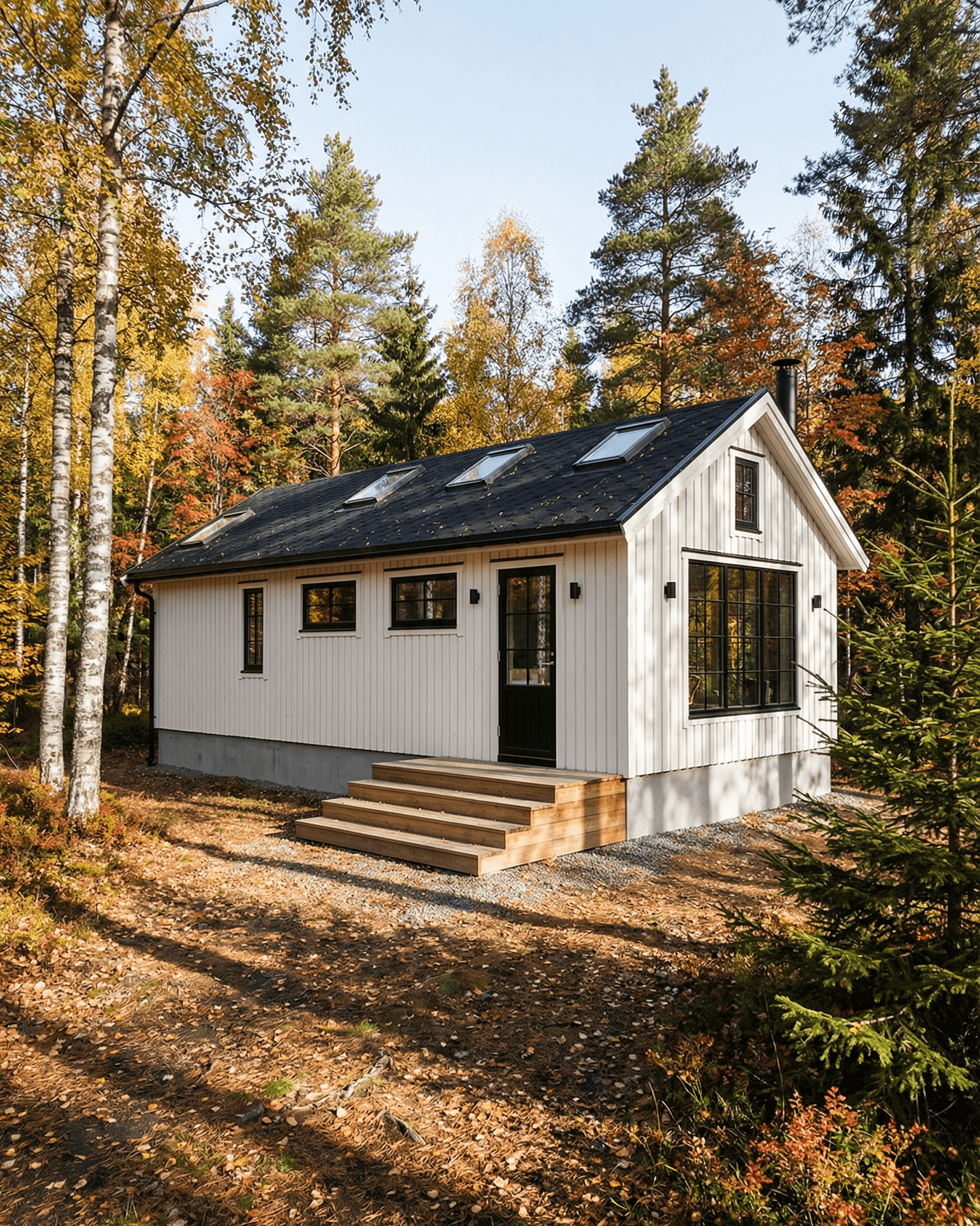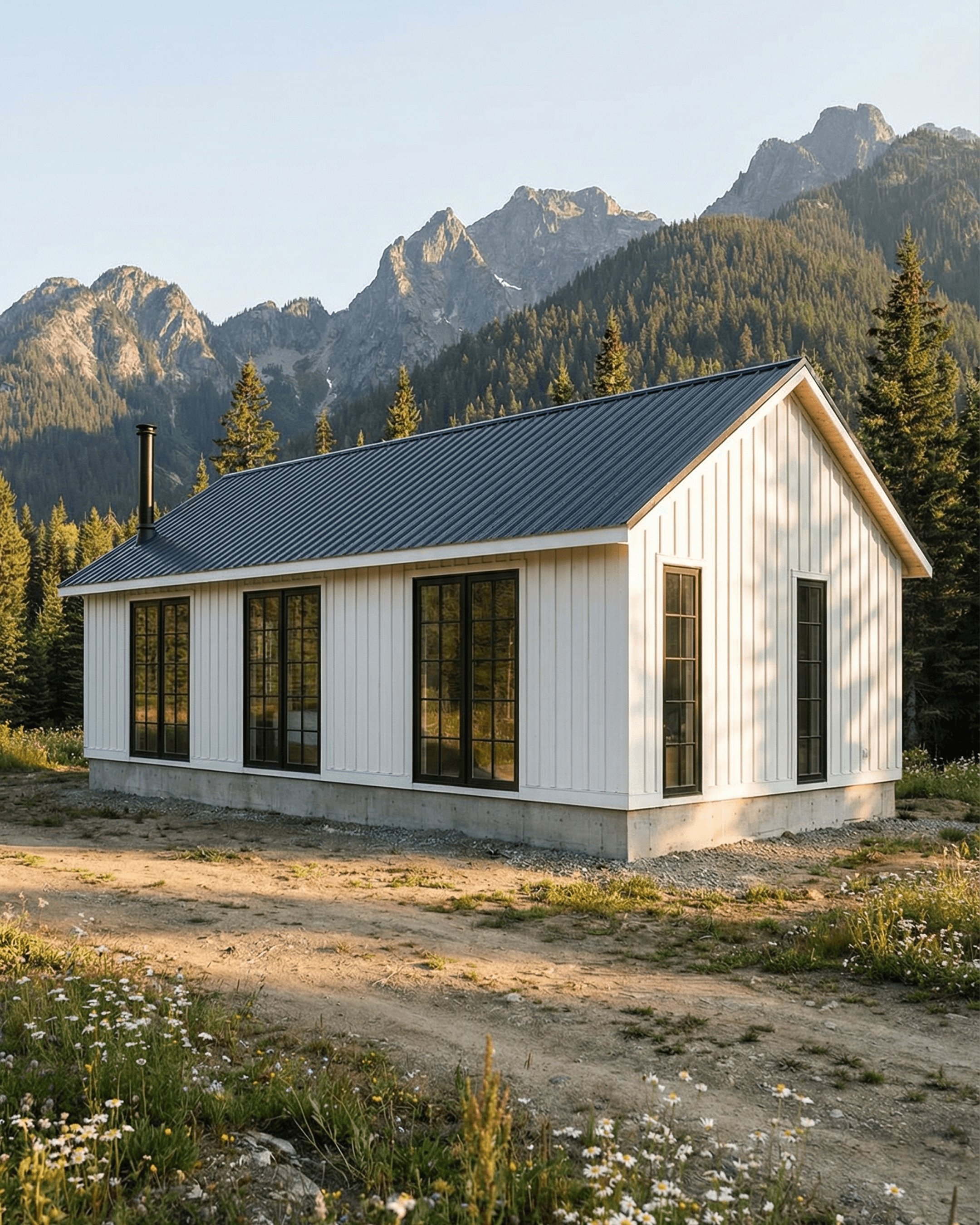The Fieldstone's silhouette is immediately recognisable. A steep gable roofline in dark corrugated iron rises over white vertical timber cladding, creating a barn-like profile that reads as deliberate and confident rather than purely rustic. It's the kind of exterior that makes 1 bedroom cabin plans feel intentional rather than improvised.