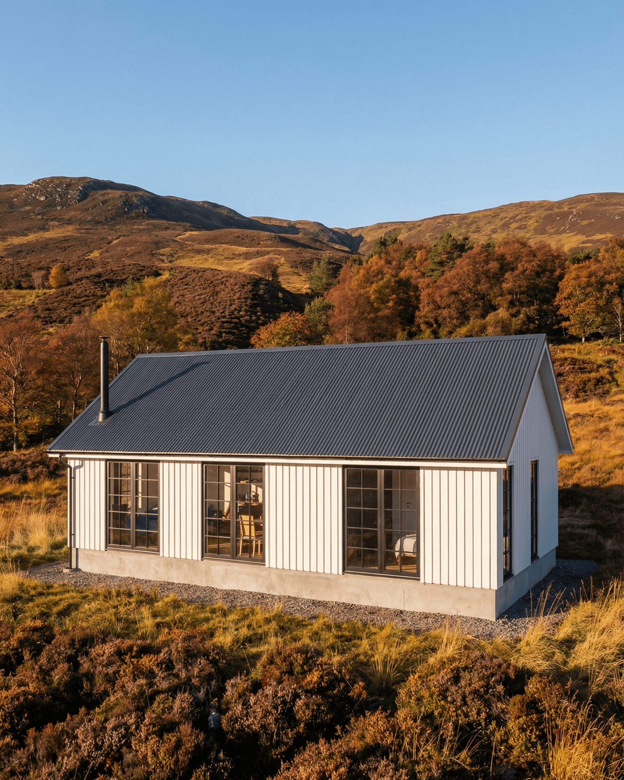 The Fieldstone reads well in multiple landscape settings. The renders show it set in an autumn birch forest, a highland moorland, and an alpine mountain meadow. The white cladding and dark corrugated roof hold their character in all three contexts, which reflects well on the strength of the exterior palette.