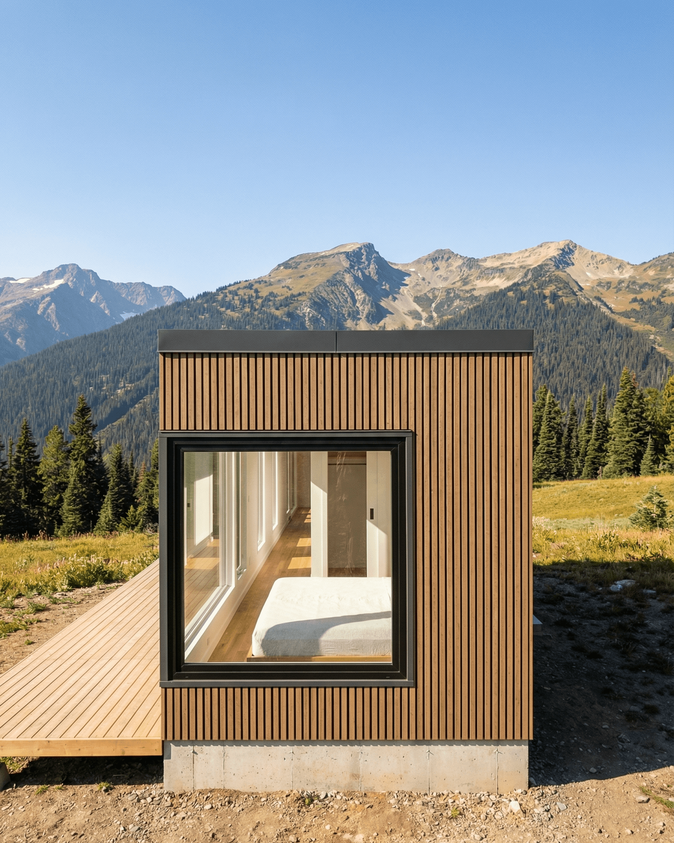 The design suits couples and individuals looking for a one-bedroom home that feels architectural without being difficult. It's particularly well-suited to mountain and nature retreat settings, where the outdoor connection and view-focused layout matter as much as the interior finish. It could work as a primary residence, a guest cabin, or a premium short-stay rental for an operator who wants a polished, design-led property. The single-level layout, with no loft sleeping or access ladders, makes it more accessible and more home-like than many compact cabins in this size range.