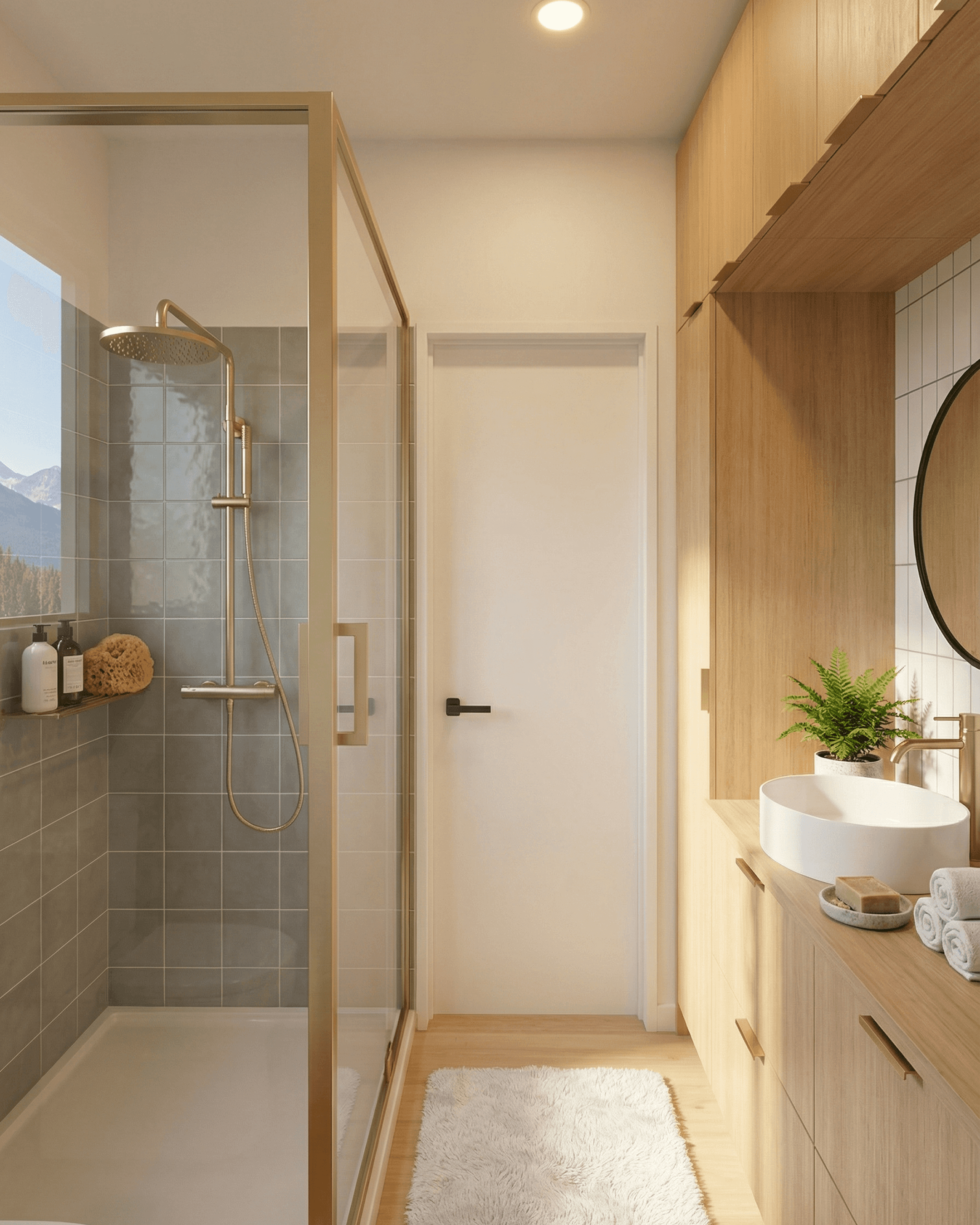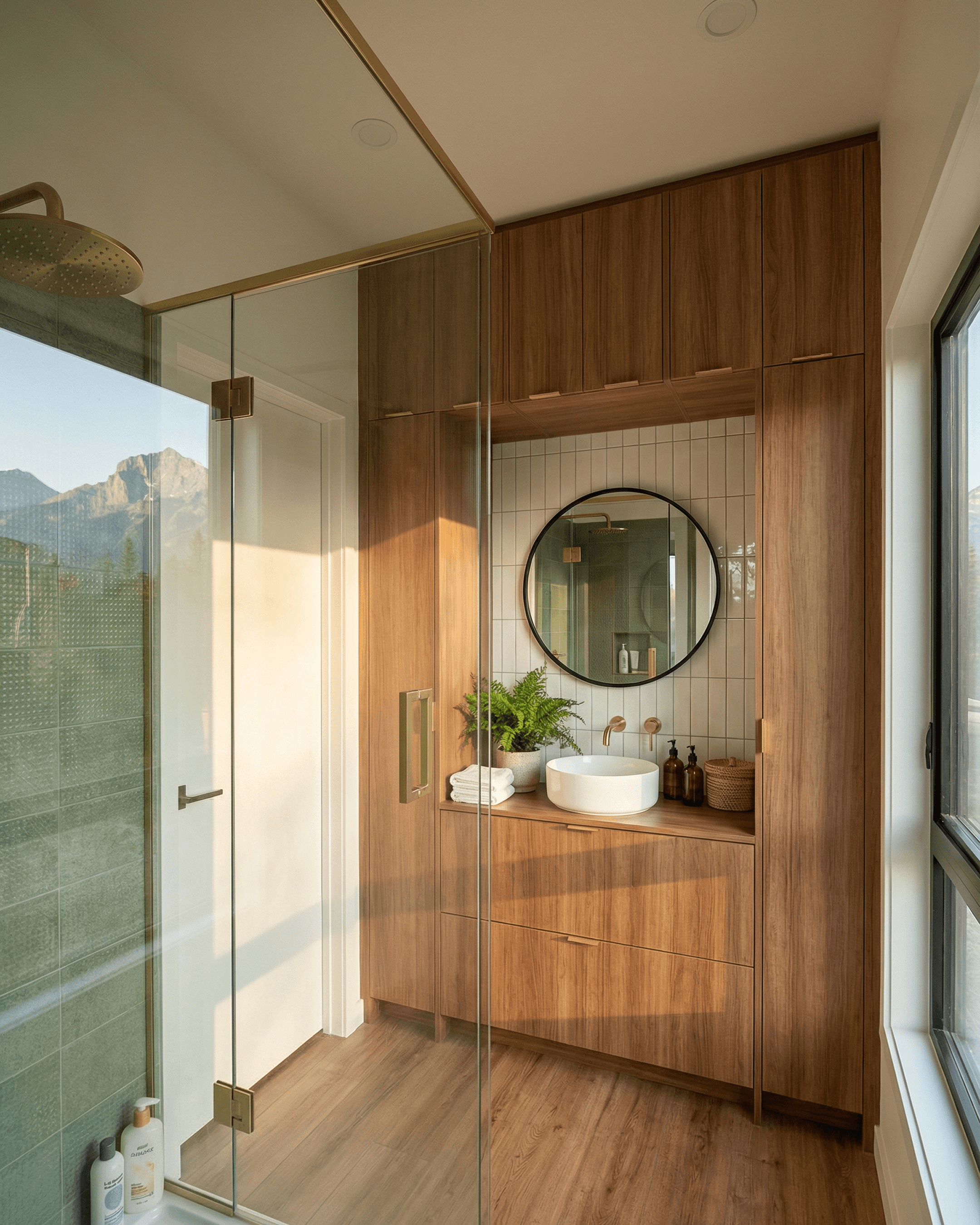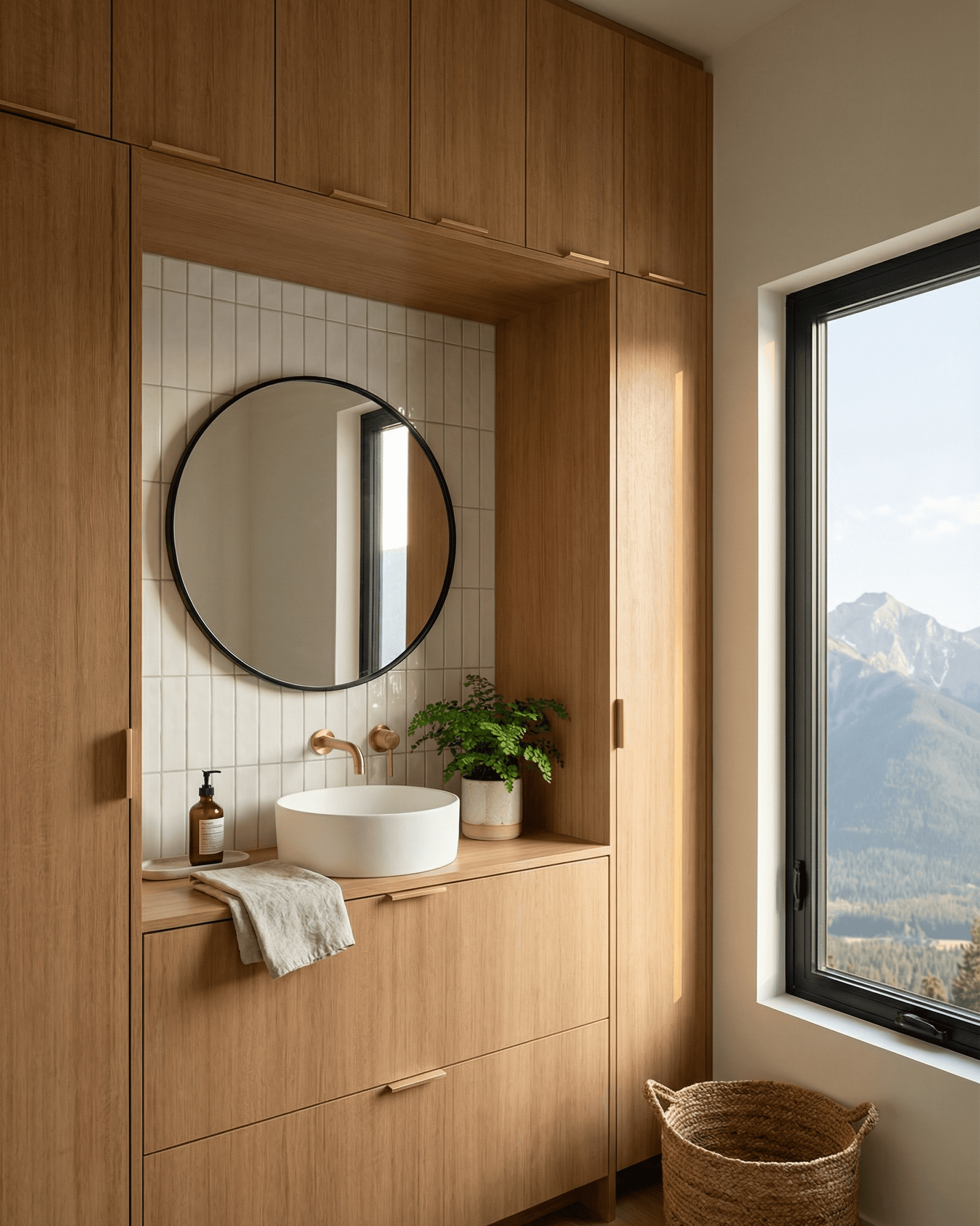 A mountain-view window sits to one side of the vanity, which adds natural light to the room and gives the space a more generous feel than a windowless bathroom would.