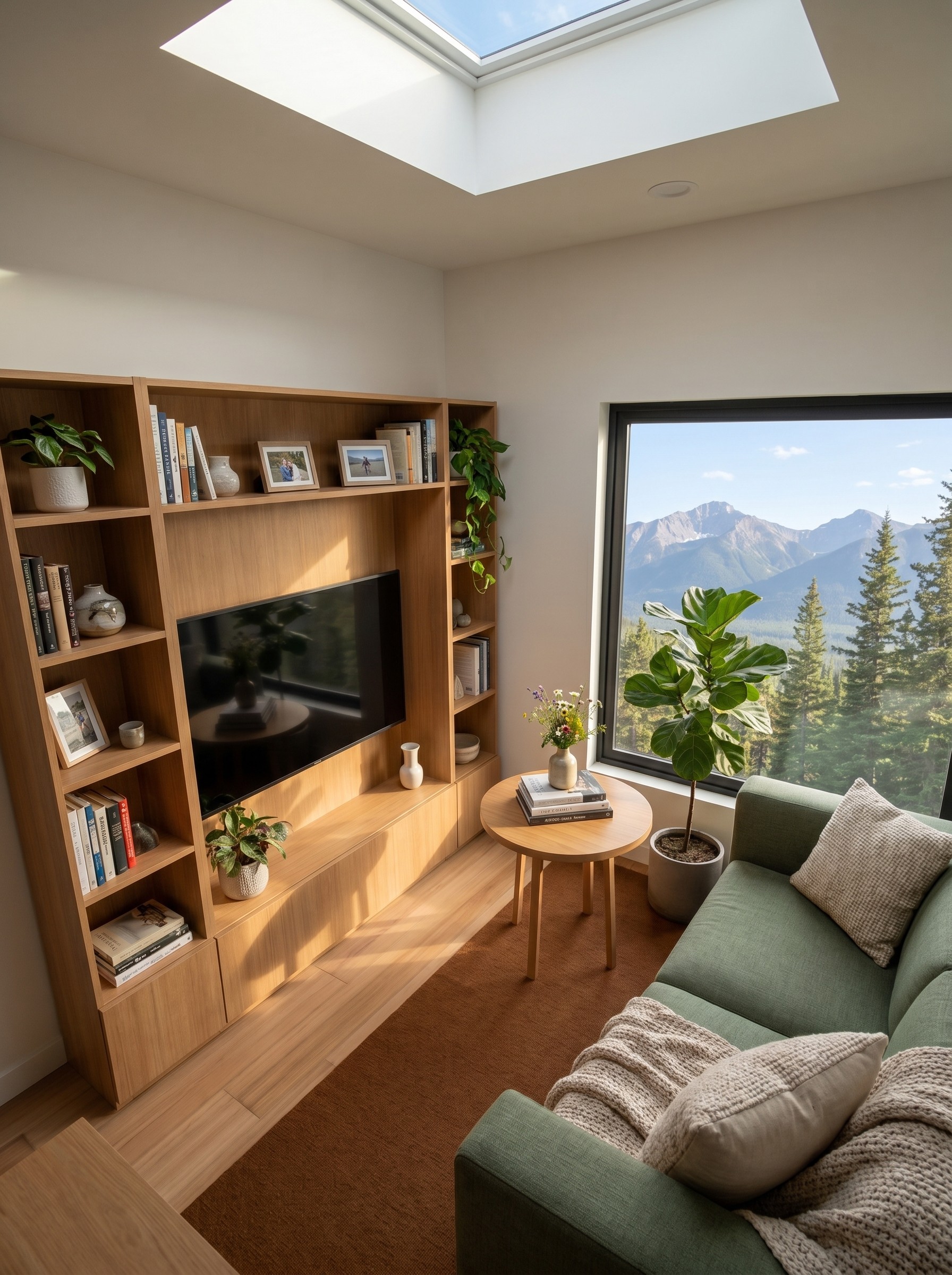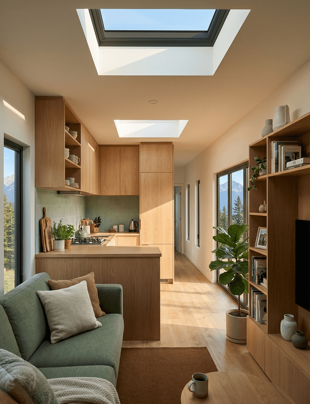 A sage-green sofa anchors the seating area, positioned to face the mountain-view picture window at the far end of the living space. From the sofa, the view is framed by the window rather than obscured by it, which is a deliberate layout decision that makes the living room feel more connected to the setting outside. An open bookshelf unit occupies one long wall, adding both storage and character without the room feeling cluttered.