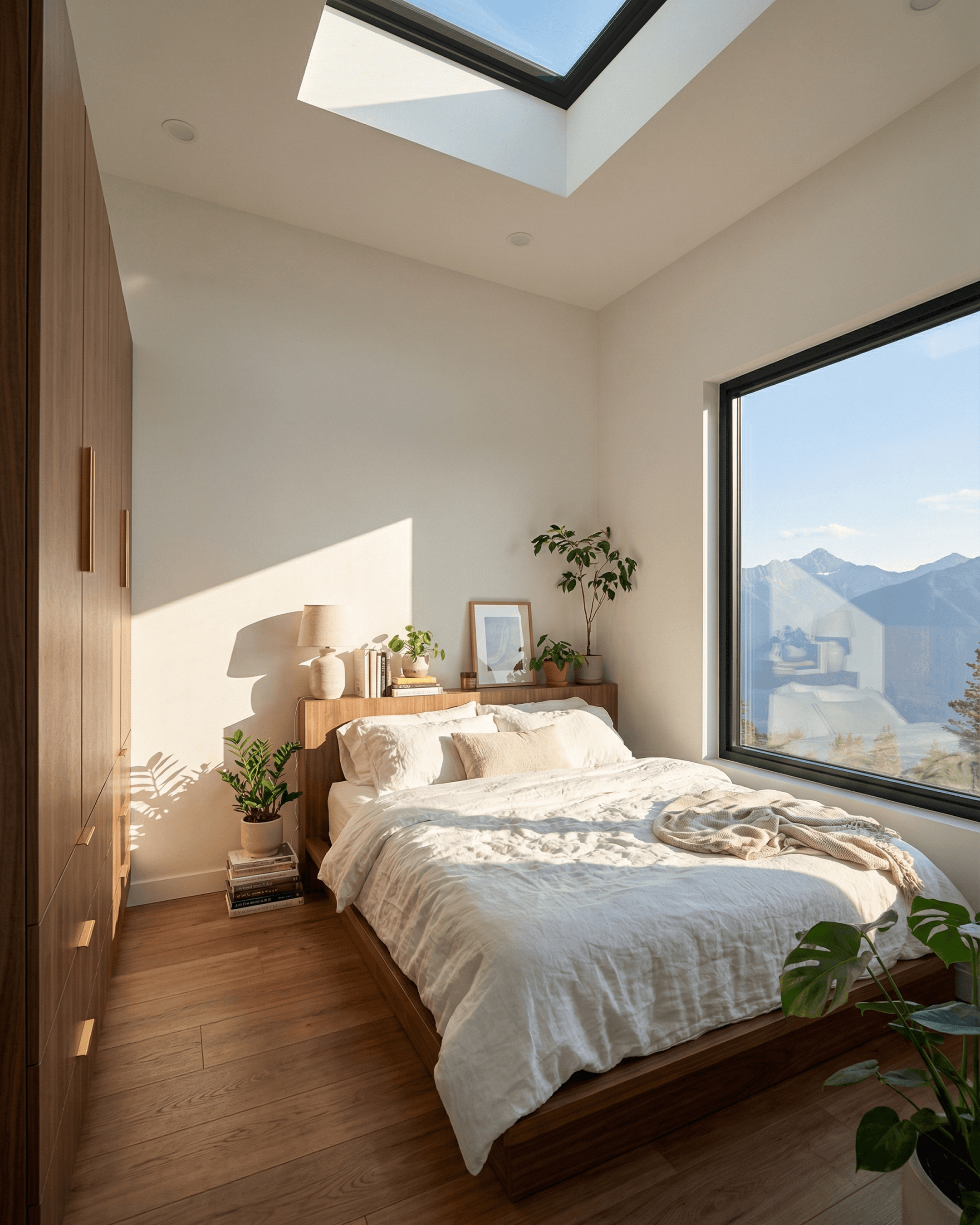Skylight above the bed brings daylight down from directly overhead, shifting across the room throughout the day