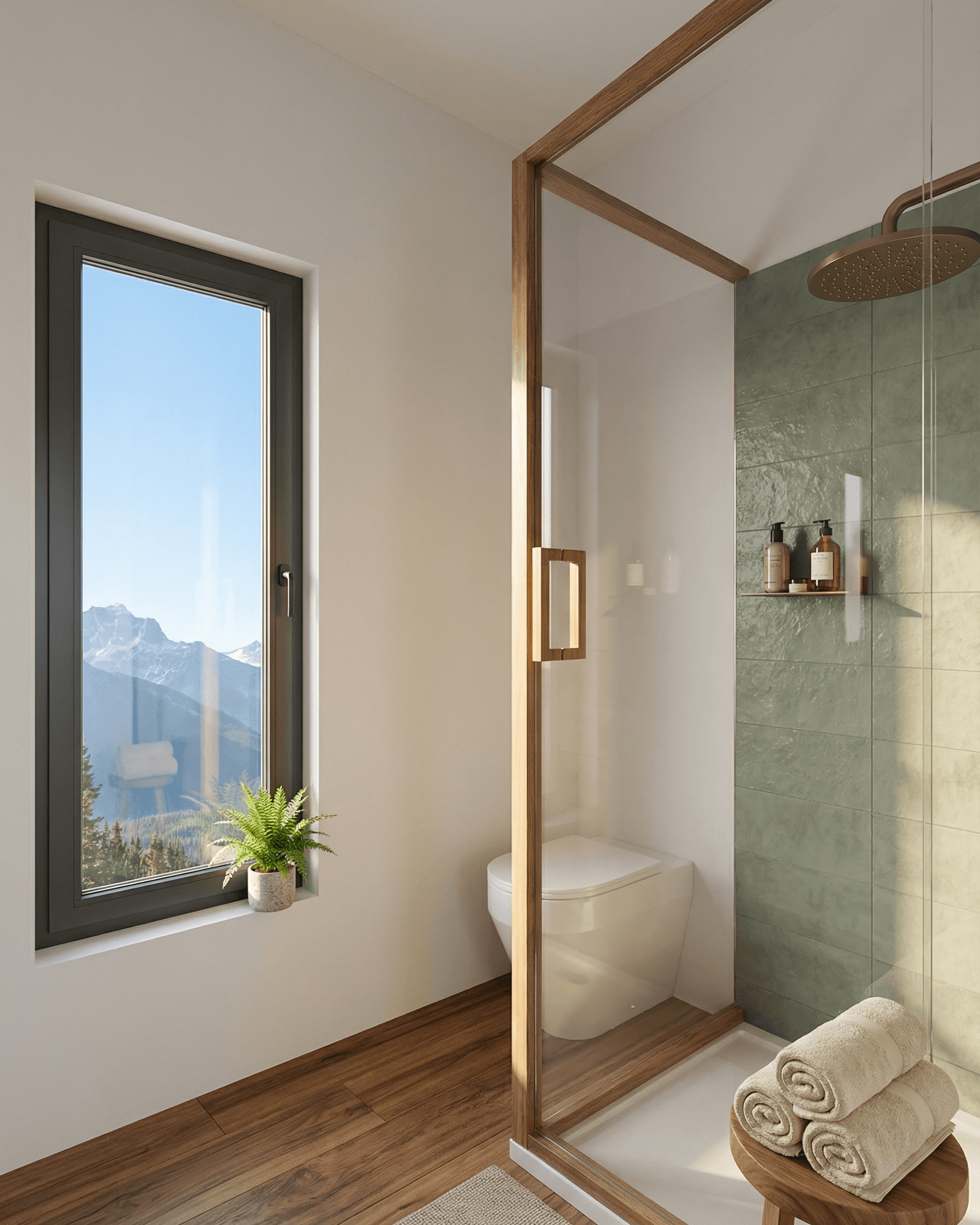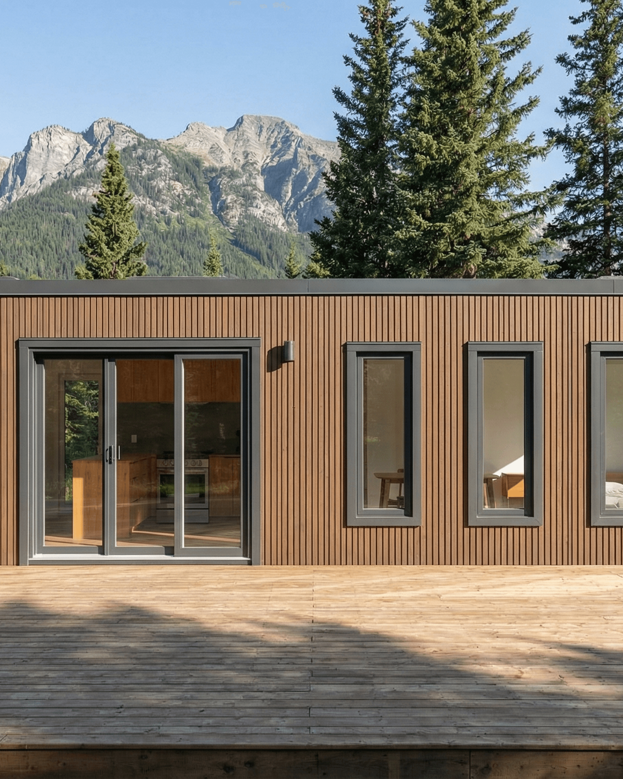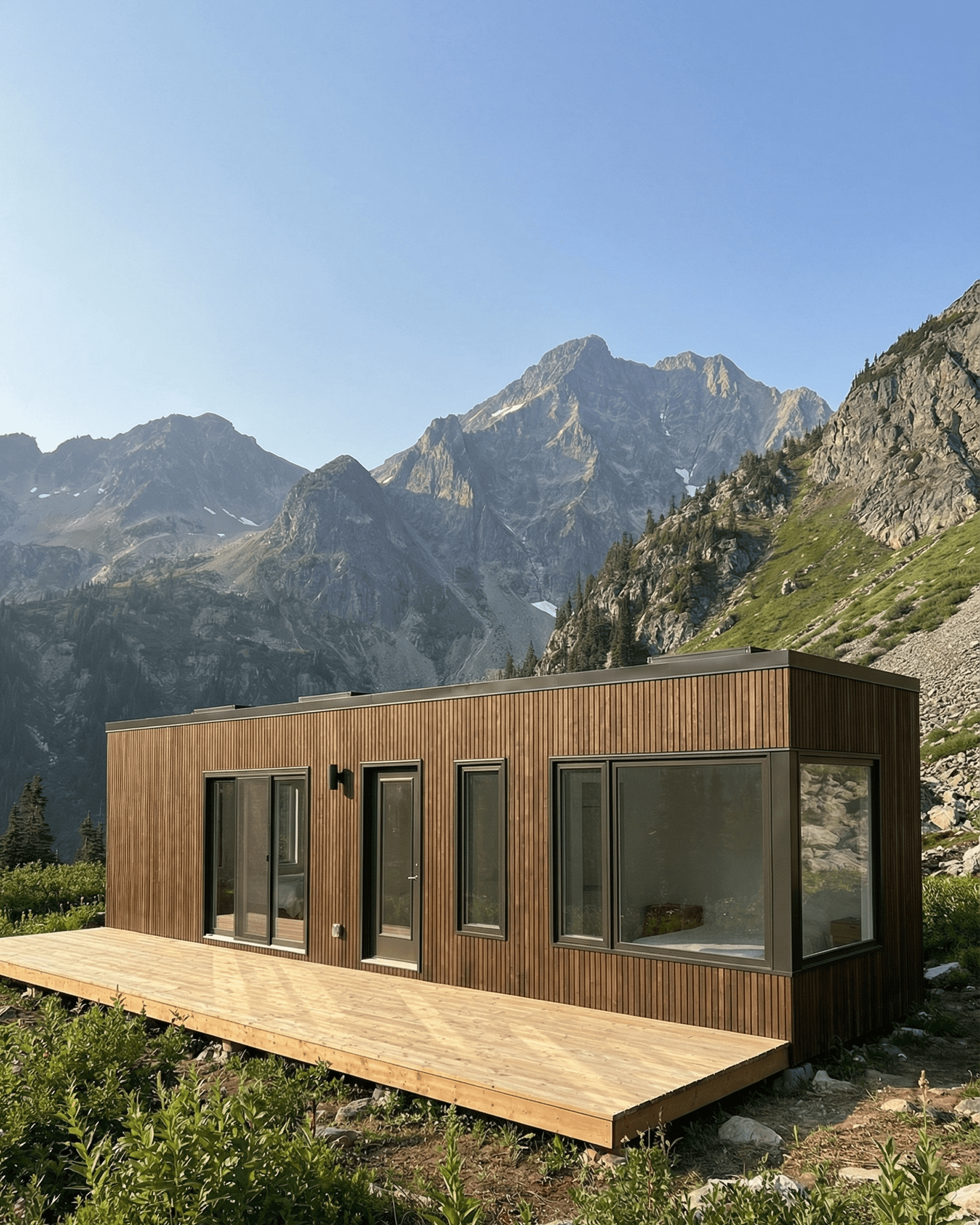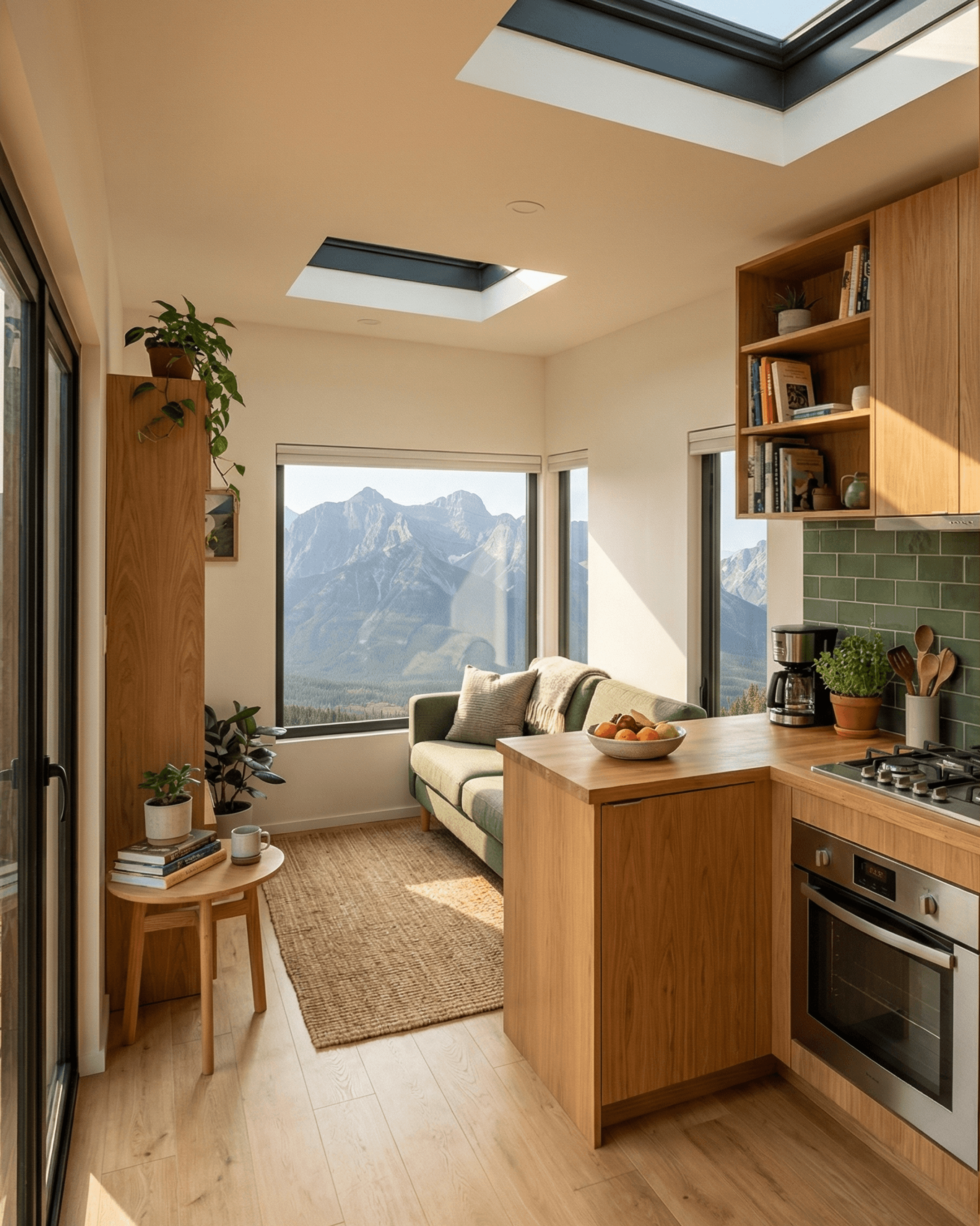 The aesthetic sits in a considered middle ground. It has the clean, prefab-inspired silhouette of a contemporary modular design, but the interior is warm, tactile, and lodge-adjacent rather than cold or overly minimal. Warm timber cabinetry, sage-green tile, brass fixtures, and a bedroom built around mountain views all contribute to a design that feels genuinely enjoyable to spend time in, not just impressive in photographs.