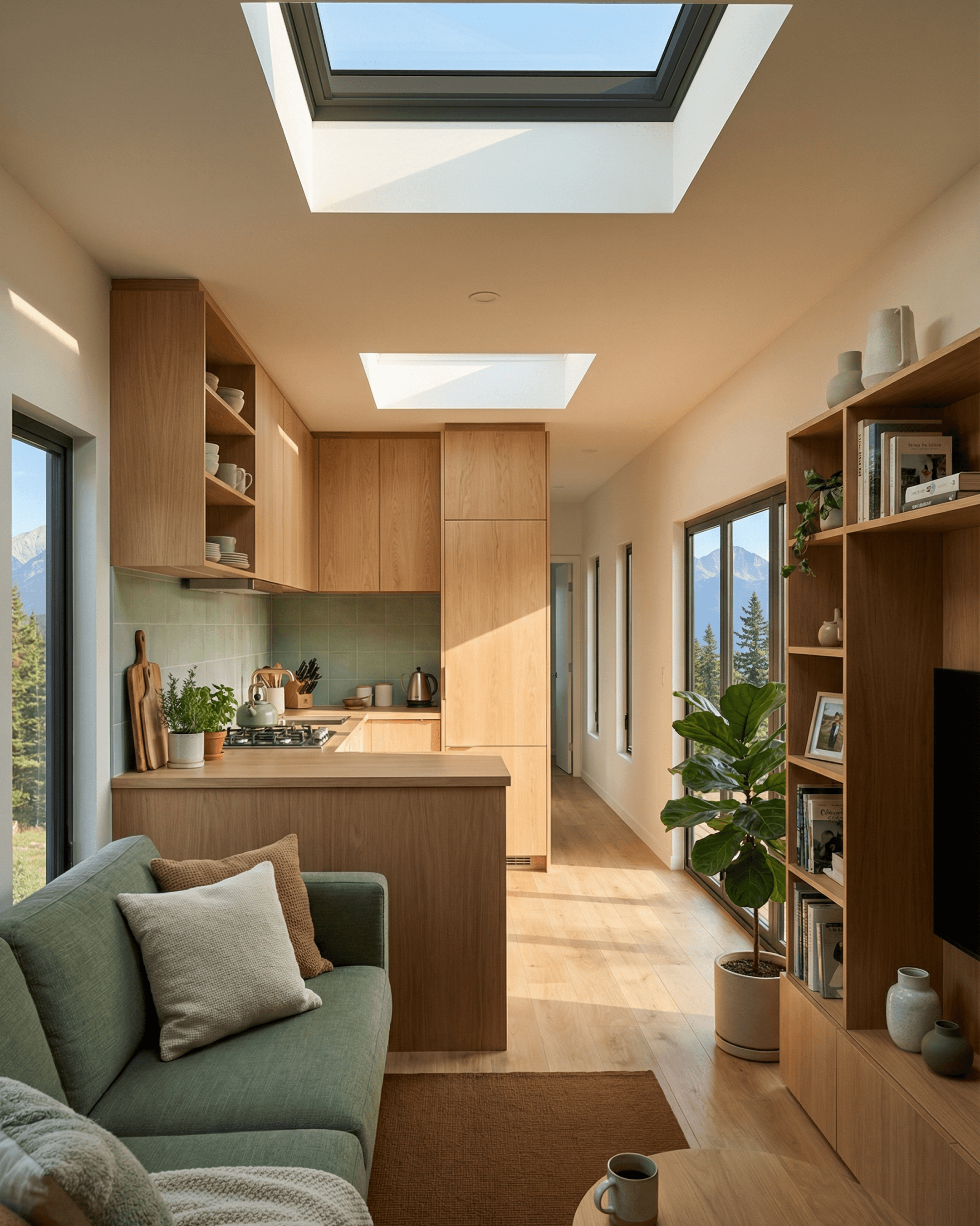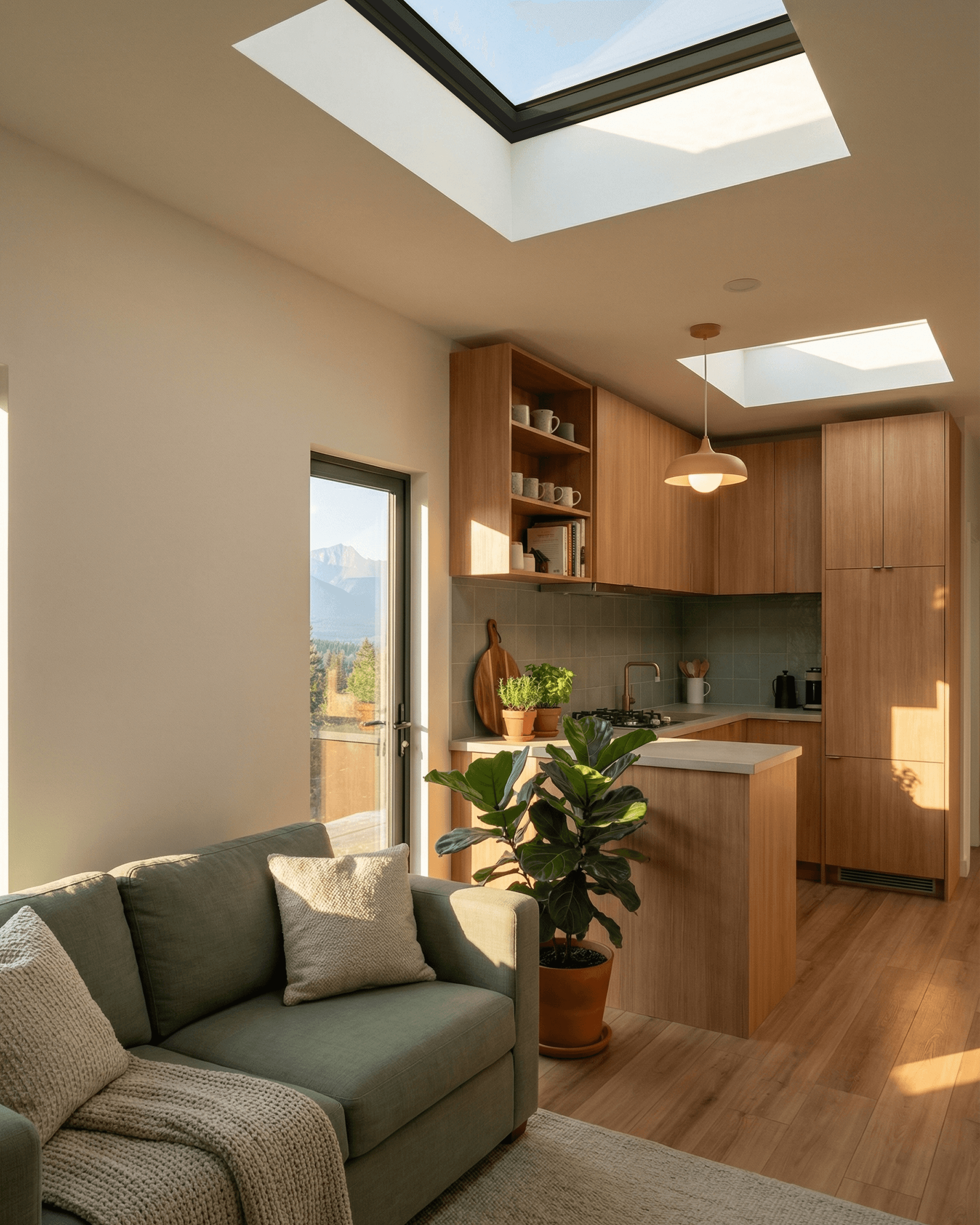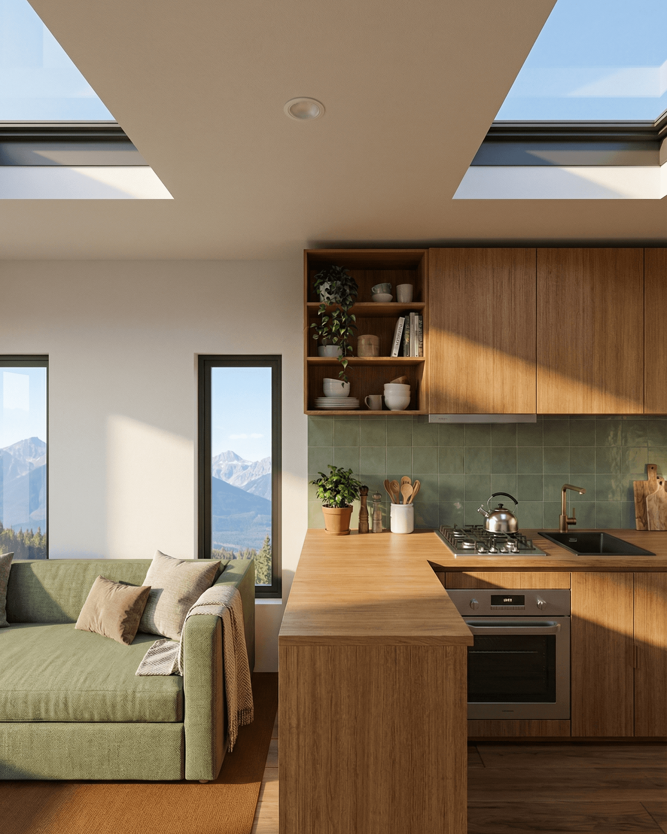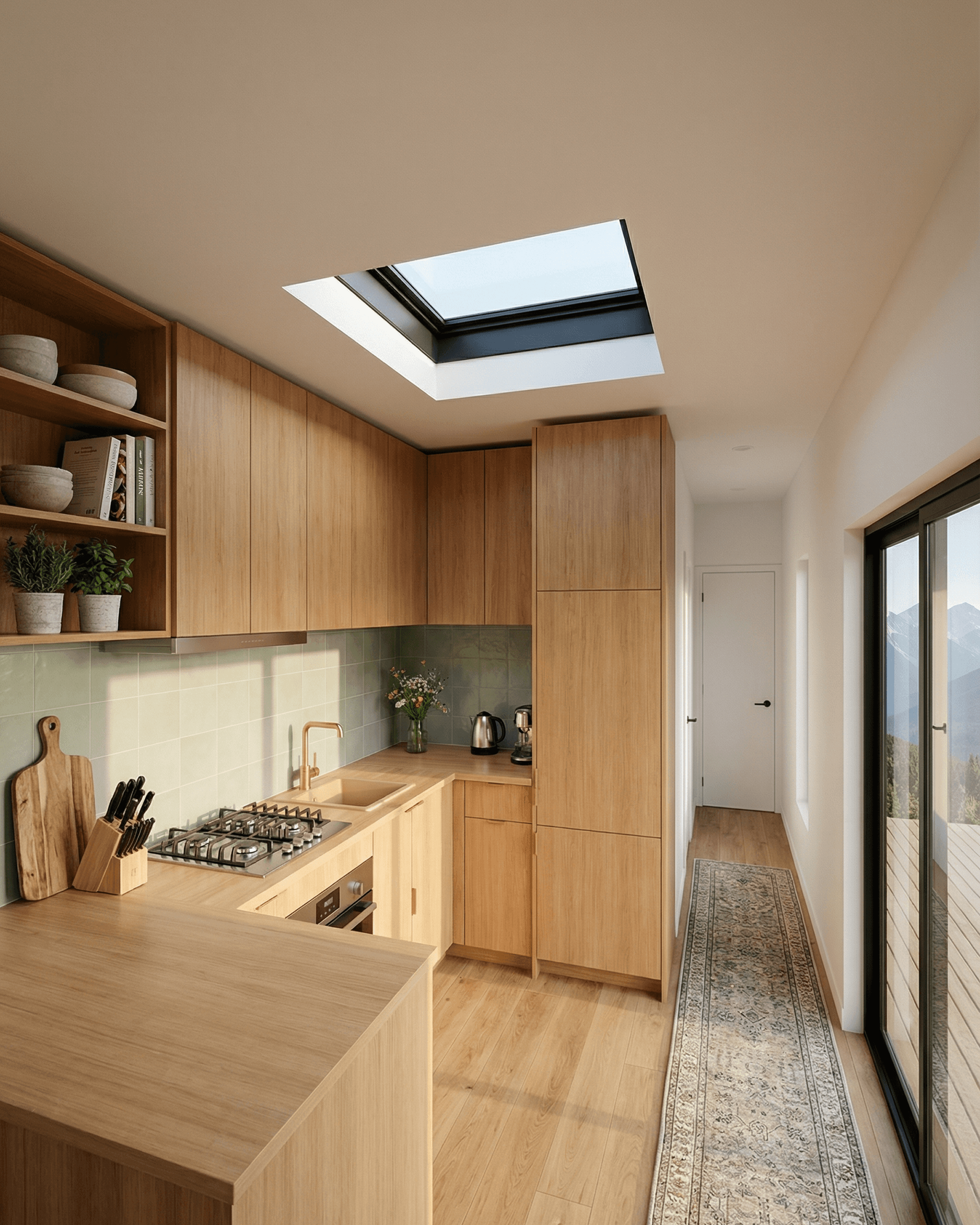 Skylight directly above the kitchen zone, providing natural overhead light throughout the day