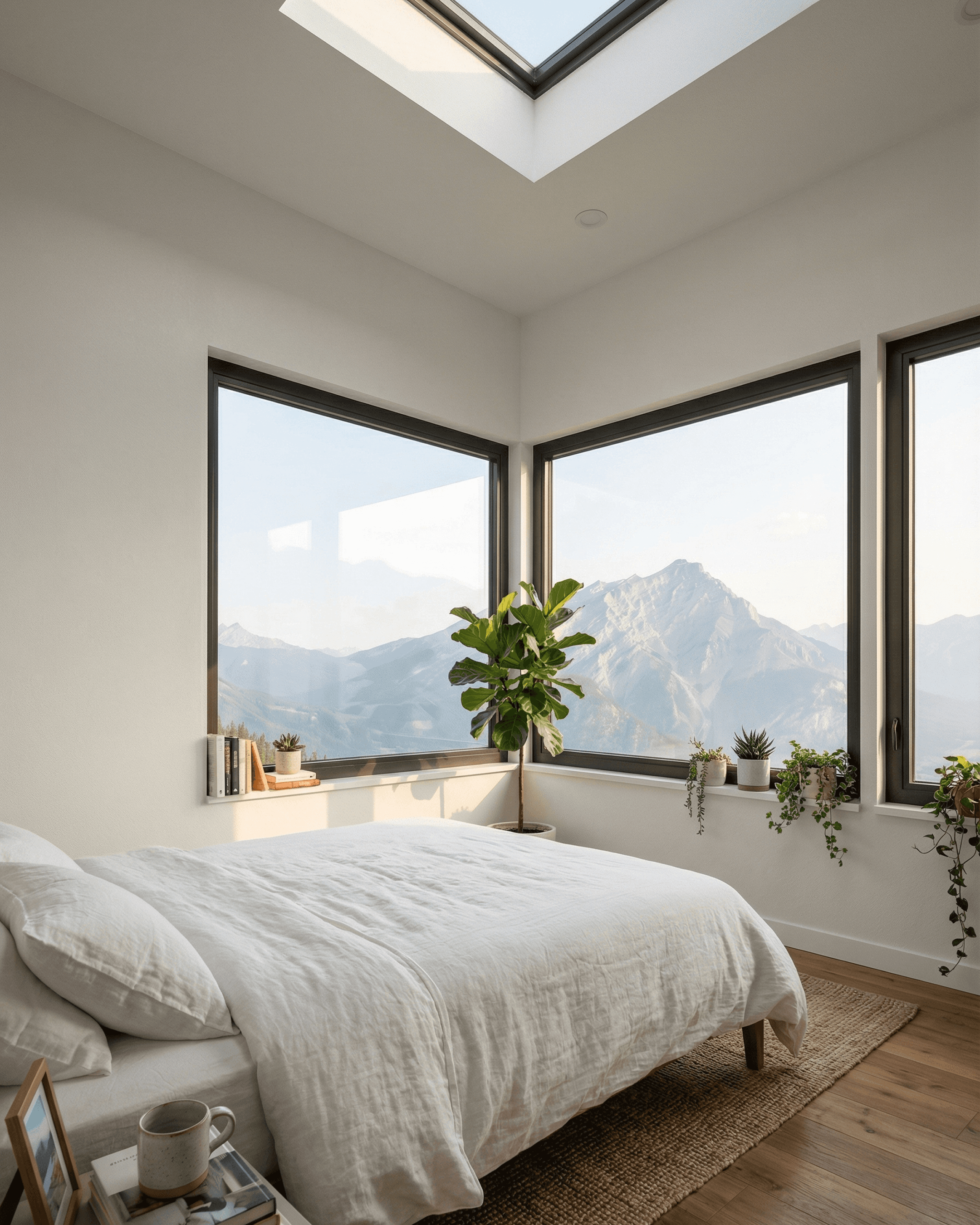 A skylight above the bed brings natural light down from above throughout the day, shifting across the room as the sun moves. A large picture window faces the mountain setting directly, framing a clear view from the bed. In a second render angle, two windows meet at the corner of the room, giving an even wider panorama of the landscape outside. Whether that's a single large window or a corner configuration, the bedroom is clearly arranged to make the view part of the experience of being in the room.