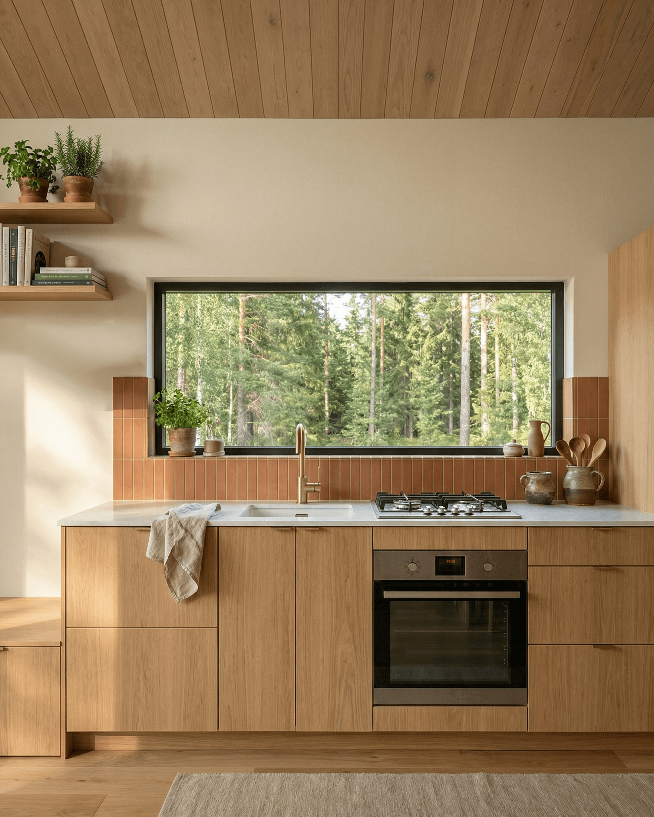 Between the kitchen run and living nook, a short terracotta-tiled splashback introduces the cabin's first pop of colour — warm brick-red rectangular tiles that echo the exterior cladding and offer a preview of the bathroom palette to come. Open timber shelving above holds cookbooks, ceramics, and a few trailing plants, giving the kitchen an approachable, lived-in feel.