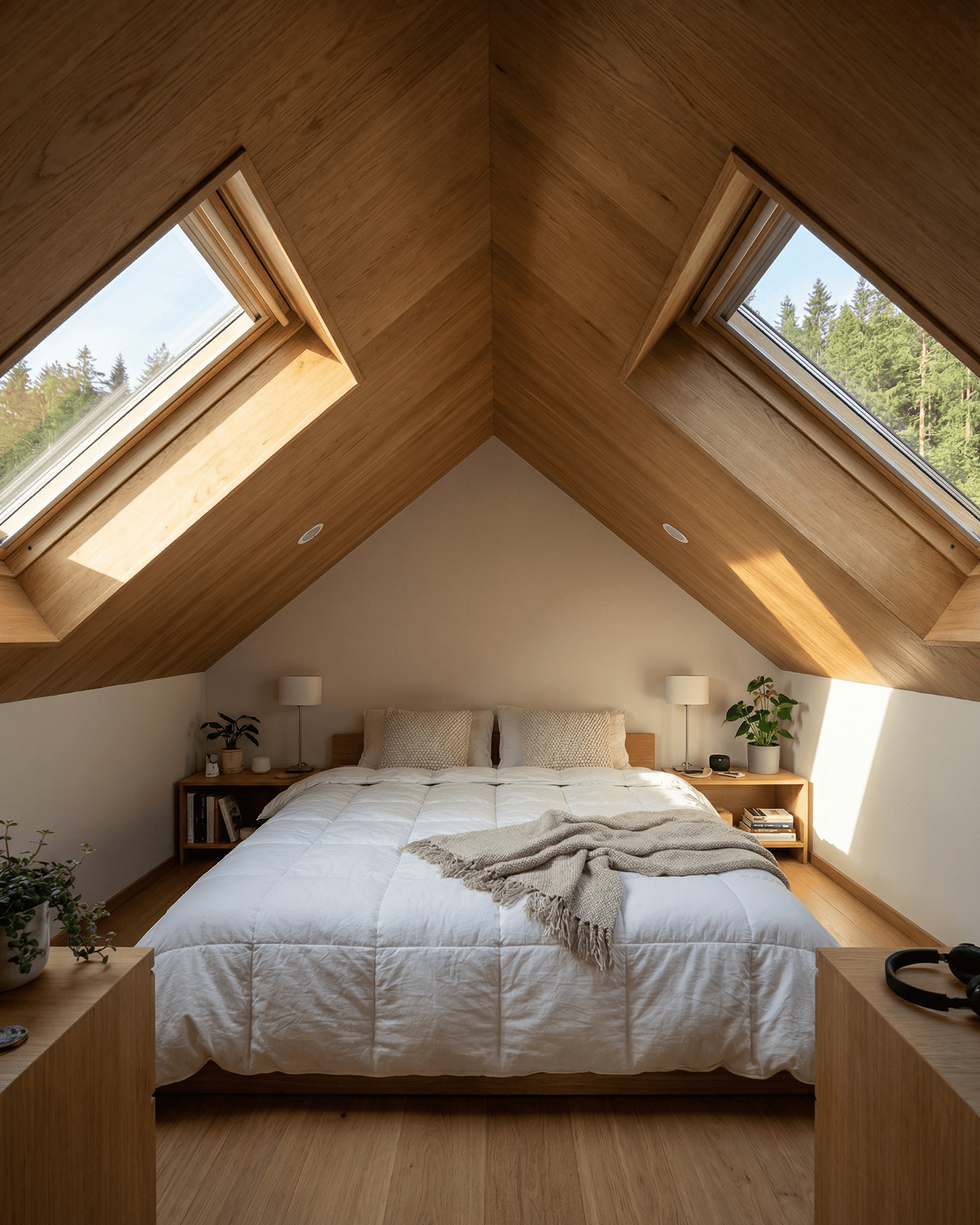 Two large skylights set symmetrically into the roof bring natural light directly into the sleeping space, while the gable-end picture window at the foot of the bed frames an outlook to the outdoors. It's a well-resolved loft bedroom that makes smart use of the roofline geometry.