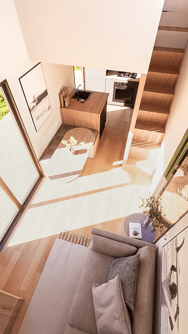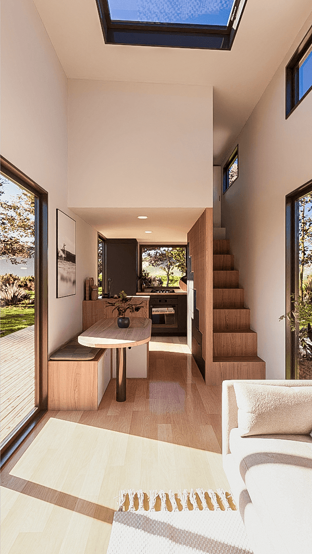 Step into a bright, open tiny house interior featuring floor-to-ceiling windows and a captivating skylight. Abundant natural light floods the space, creating an open and inviting ambiance that seamlessly blends indoor comfort with the beauty of the outdoors.