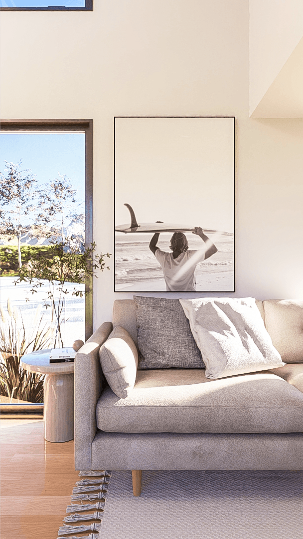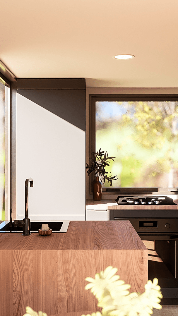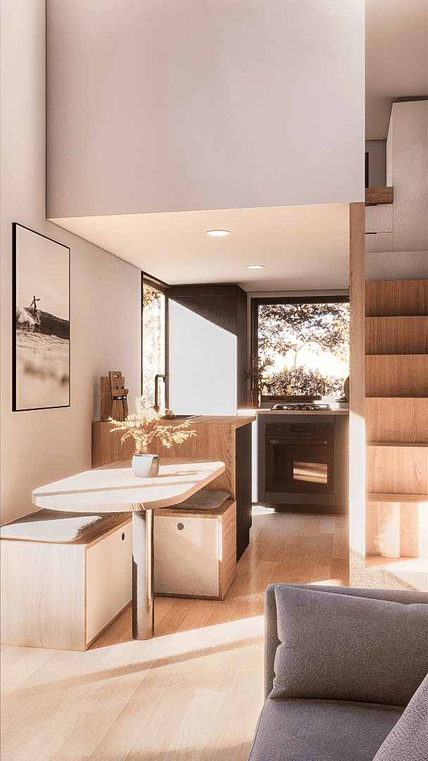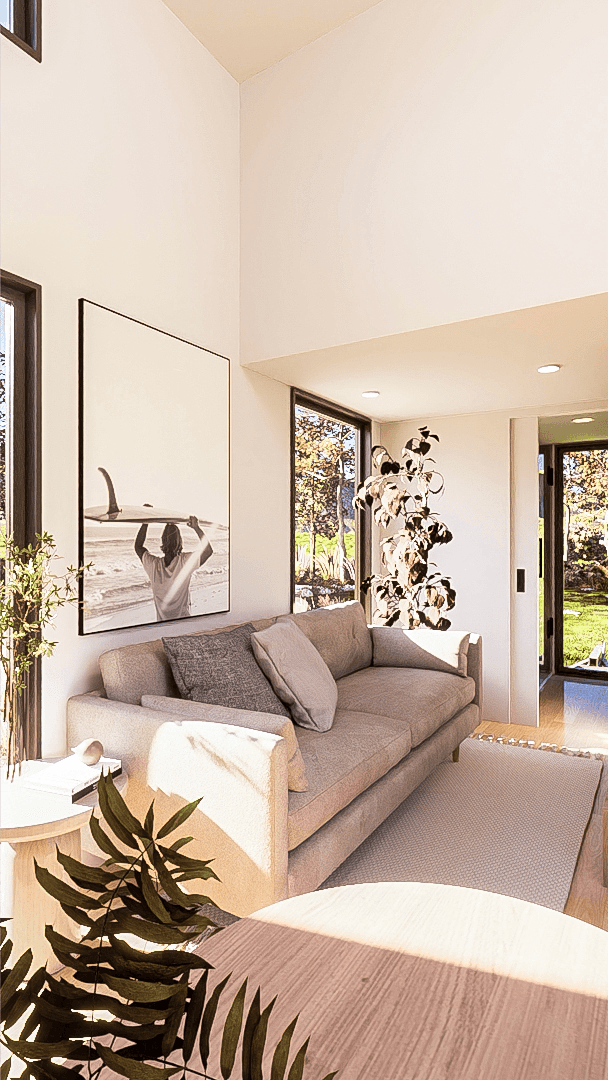 Sink into the heart of the living room, a space where comfort meets nature. With room for a full-sized sofa, plenty of plants and even room for a side-table. You'll forget your sitting in a tiny home. Plus, the floor-to-ceiling windows invites nature and light inside for a comfy atmosphere!