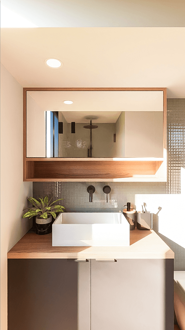 This tiny house bathroom features a galley-style layout ensuring smooth movement, letting you effortlessy access the vanity, toilet, shower and even the handy laundry cupboard. It's a space where practicality meets comfort, designed to make every movement hassle-free for a busy family.