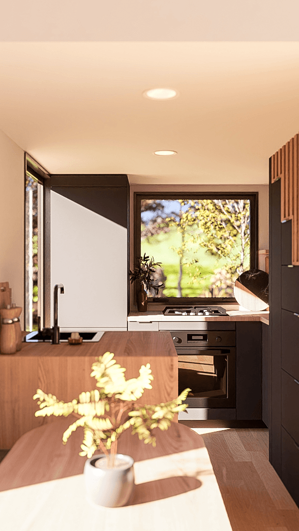 Step into this cozy kitchen - built for tiny living, loaded with plenty of storage. From pantry surprises to nifty nooks, we've got you covered. Plus, easy side-door access, keeping things breezy with natural ventilation. It's cooking, chilling, and tiny living done just right.