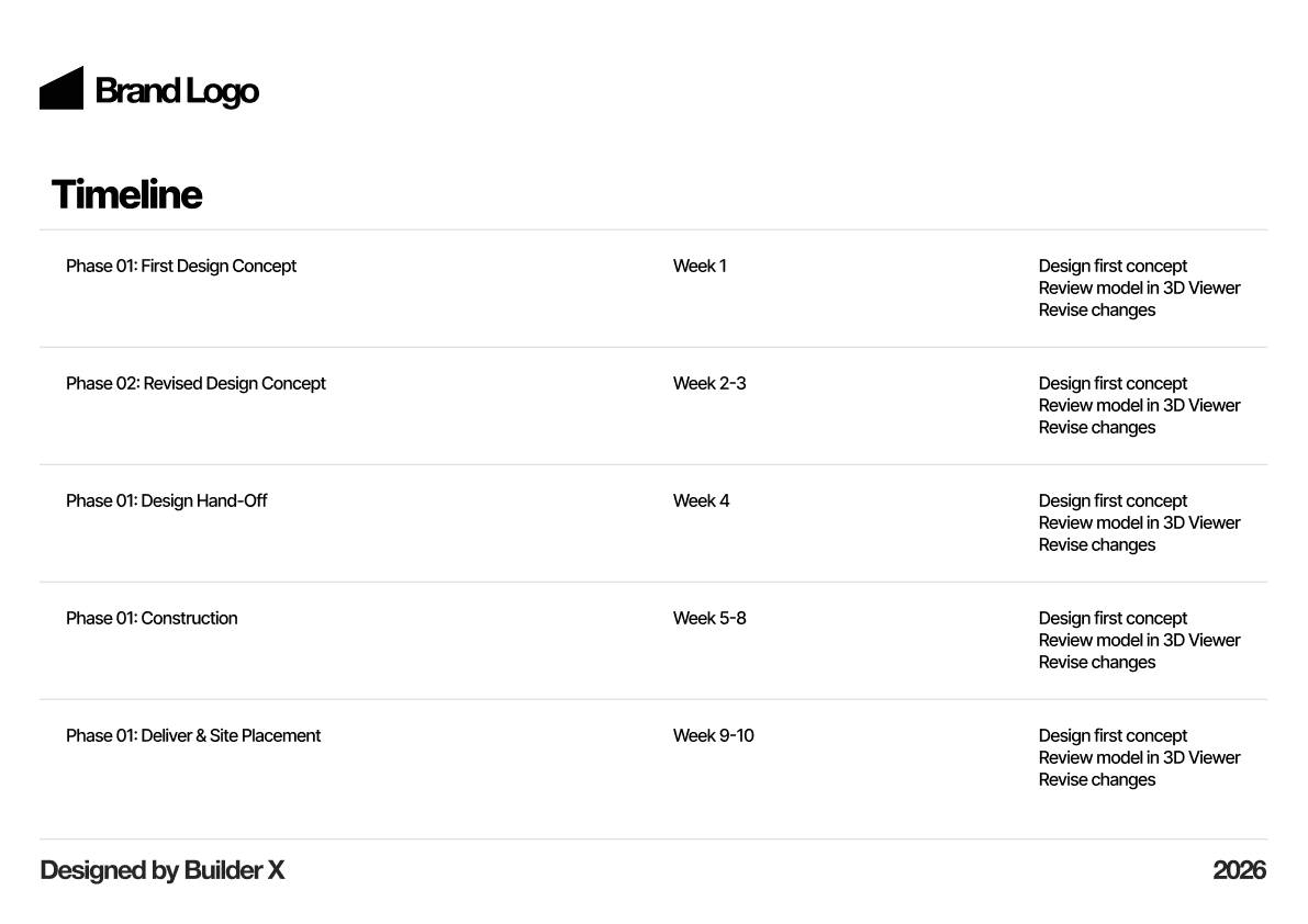 Combine AI Renders, 3D Walkthroughs, floor plans, site placement visuals, pricing and standard terms into one-polished proposal. Reduce back-and-forth, and give prospects a complete visual understanding of what they are moving forward with.