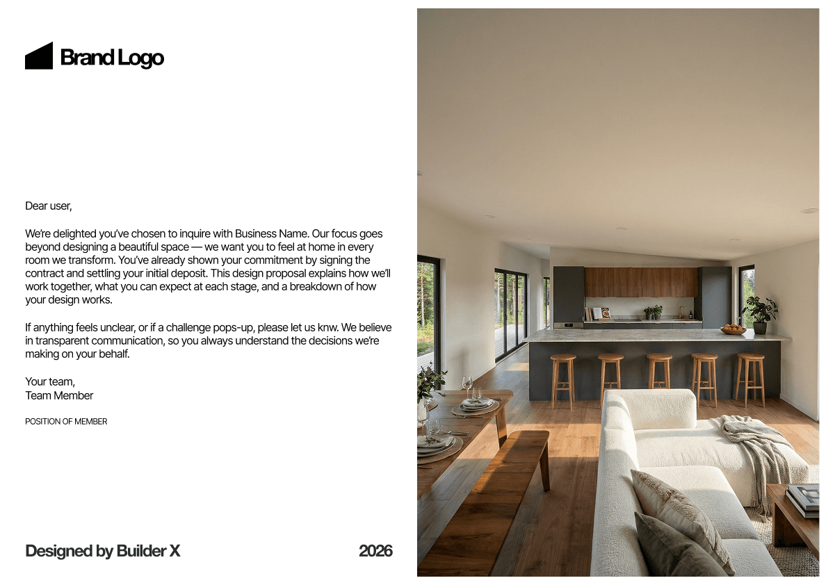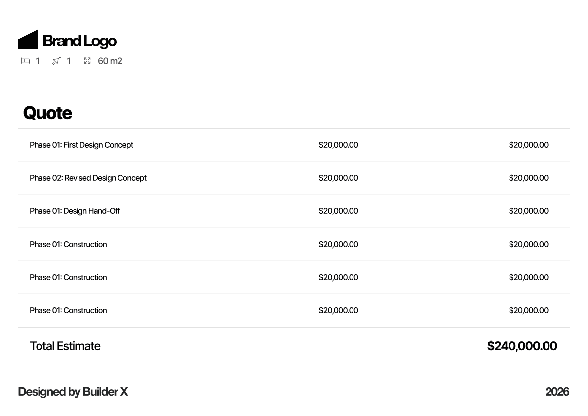 Bring together visuals, floor plans, pricing estimates, inclusions, and next steps into one cohesive presentation — without manually assembling documents.