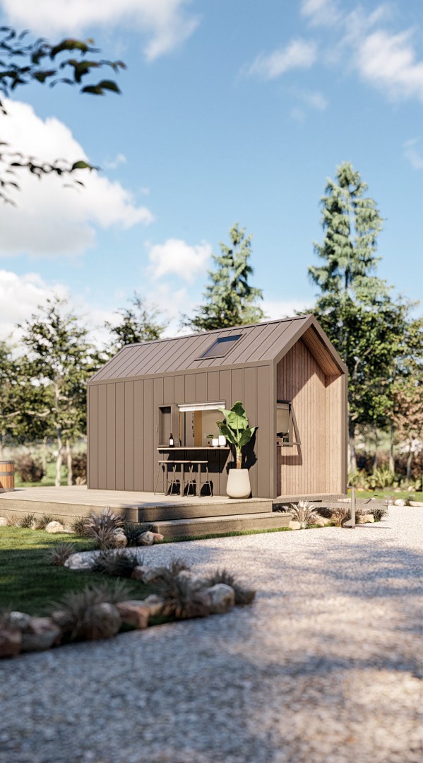 Tiny Haus features a magnificent floor-to-ceiling panoramic window paired with a beautiful timber recess adding warmth to the exterior.