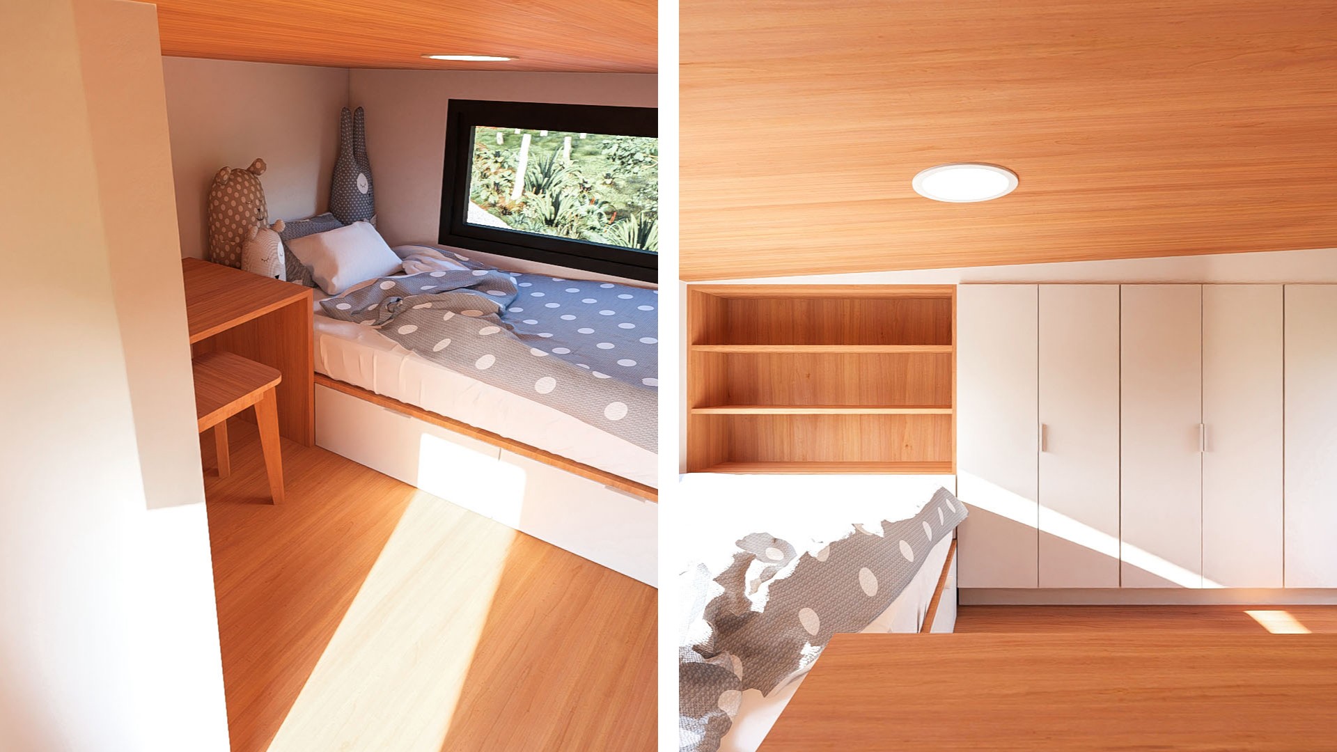 Explore the cozy living spaces in the two loft bedrooms; designed to maximize square footage and comfort. On the right, discover a snug bedroom ideal for a single bed, complete with lots of storage and space for a small desk.