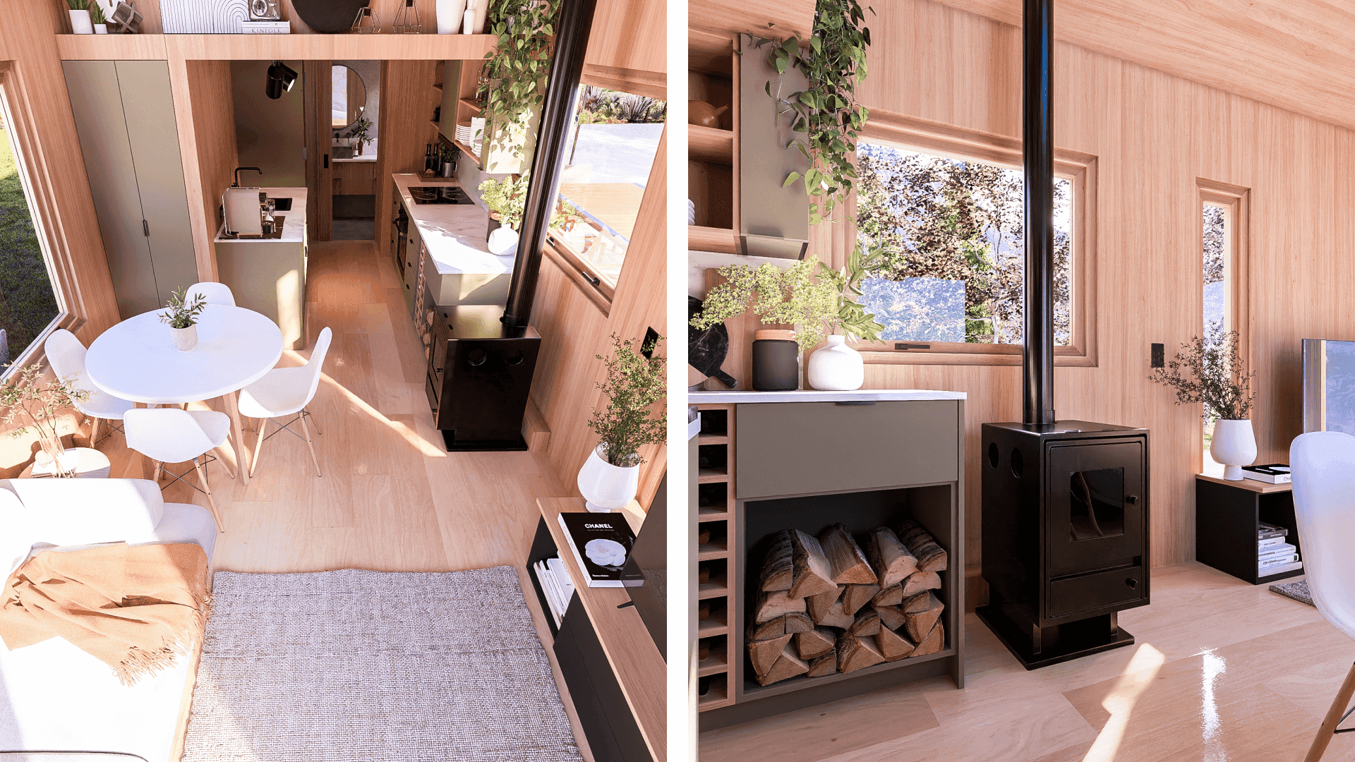 Nestled between the living room and kitchen, the Green Tiny House boasts an extra touch of warmth - with a wood burning stove perfect for a tiny home. Picture yourself curled up on the 2 seater sofa, basking in the flickering glow as it dances across the tiny home. It's not just a heating source; it's a focal point, inviting you to create cherished moments in your tiny house.